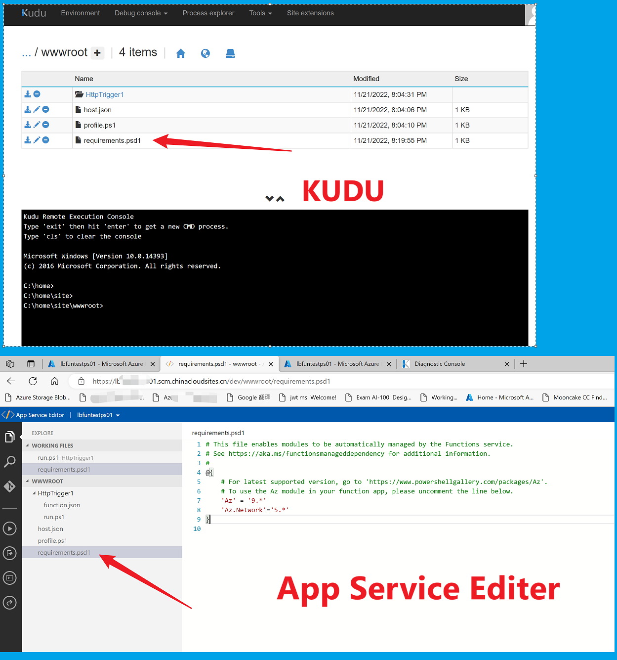 以上错误,和在本地执行Powershell命令一样,就是缺少命令对应的Powershell 模块。 只是PowerShell Function的module配置在文件 **requirements.psd1 **中, 这个文件在创建Powershell Function时候会自动生成在WWWROOT目录下,可以通过Kudu站点(https://<your function app name>.scm.chinacloudsites.cn/),或者是 App Service Editer 页面进行修改。