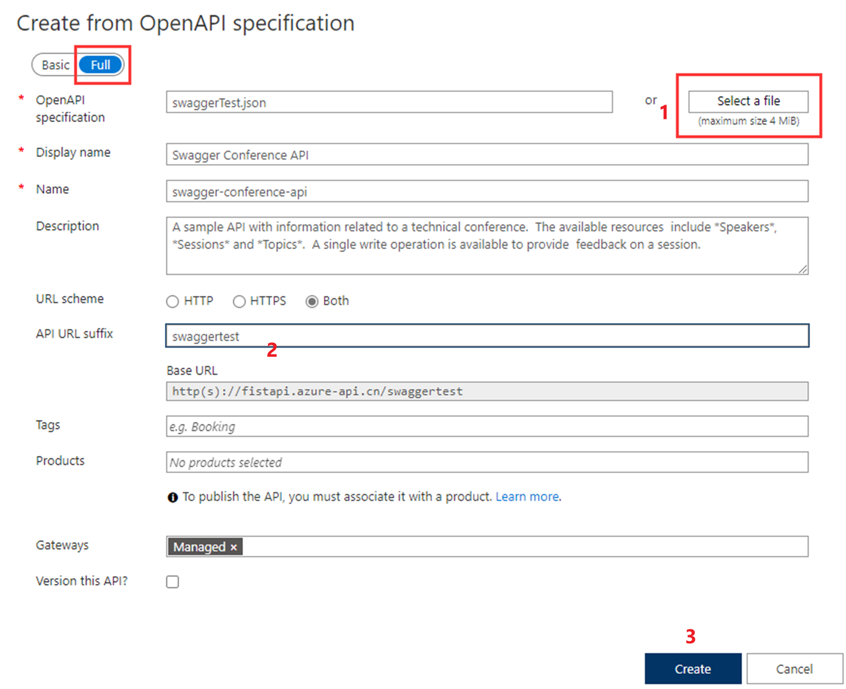 第二步:点击Full,然后点击Select a file,在本地选择一个定义好的Swagger API json 文件(如:swaggerTest.json),添加相应信息后创建,就可以生成API。