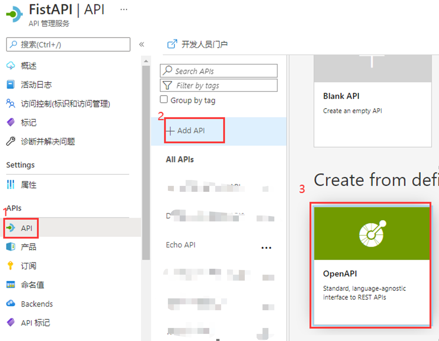 第一步:APIM实例下点击API,然后点击Add API,选择OpenAPI,如下图所示