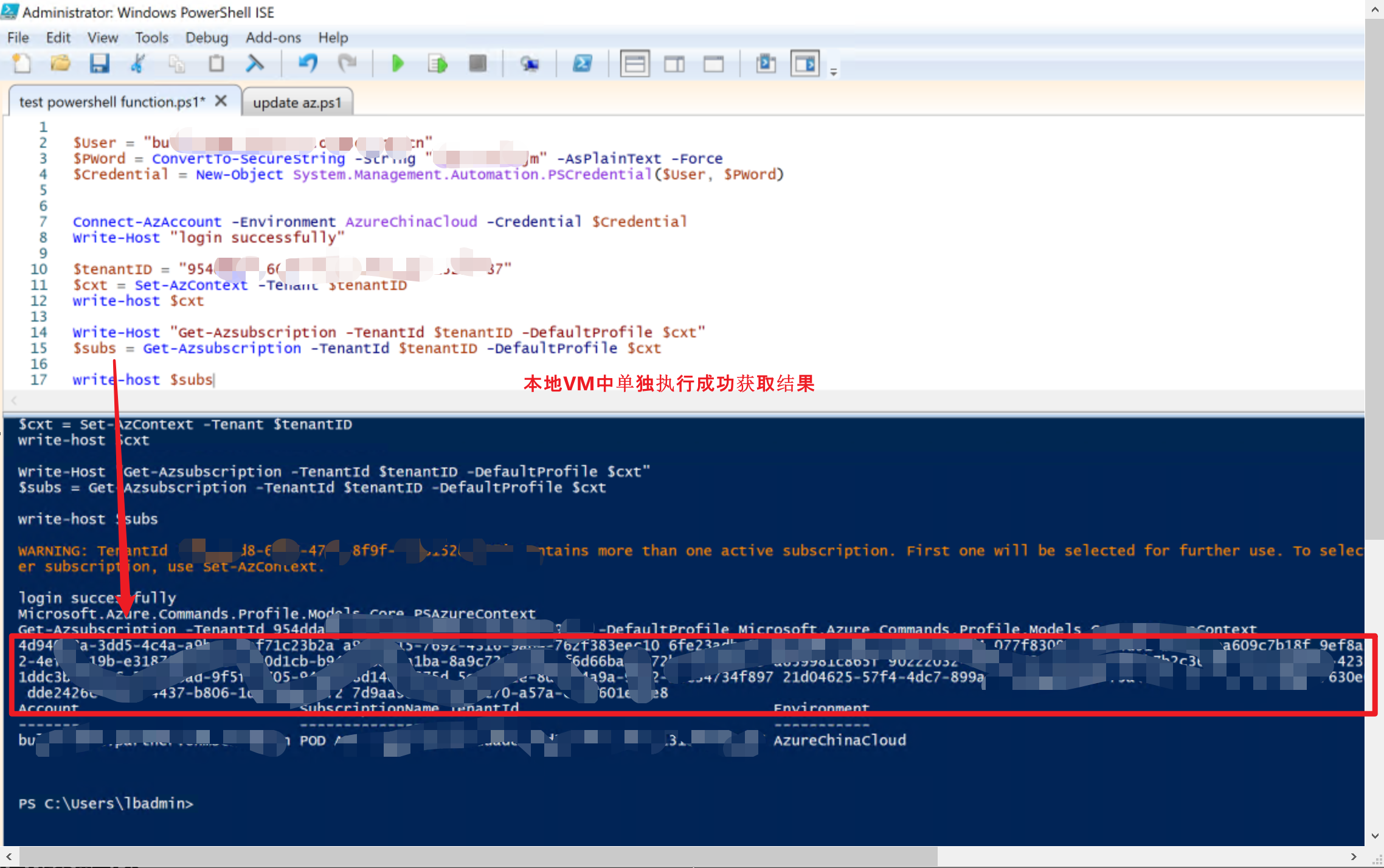 使用PowerShell脚本执行获取Azure订阅列表的指令(Get-Azsubscription -TenantId $tenantID -DefaultProfile $cxt)。在本地调试后,指令成功运行。