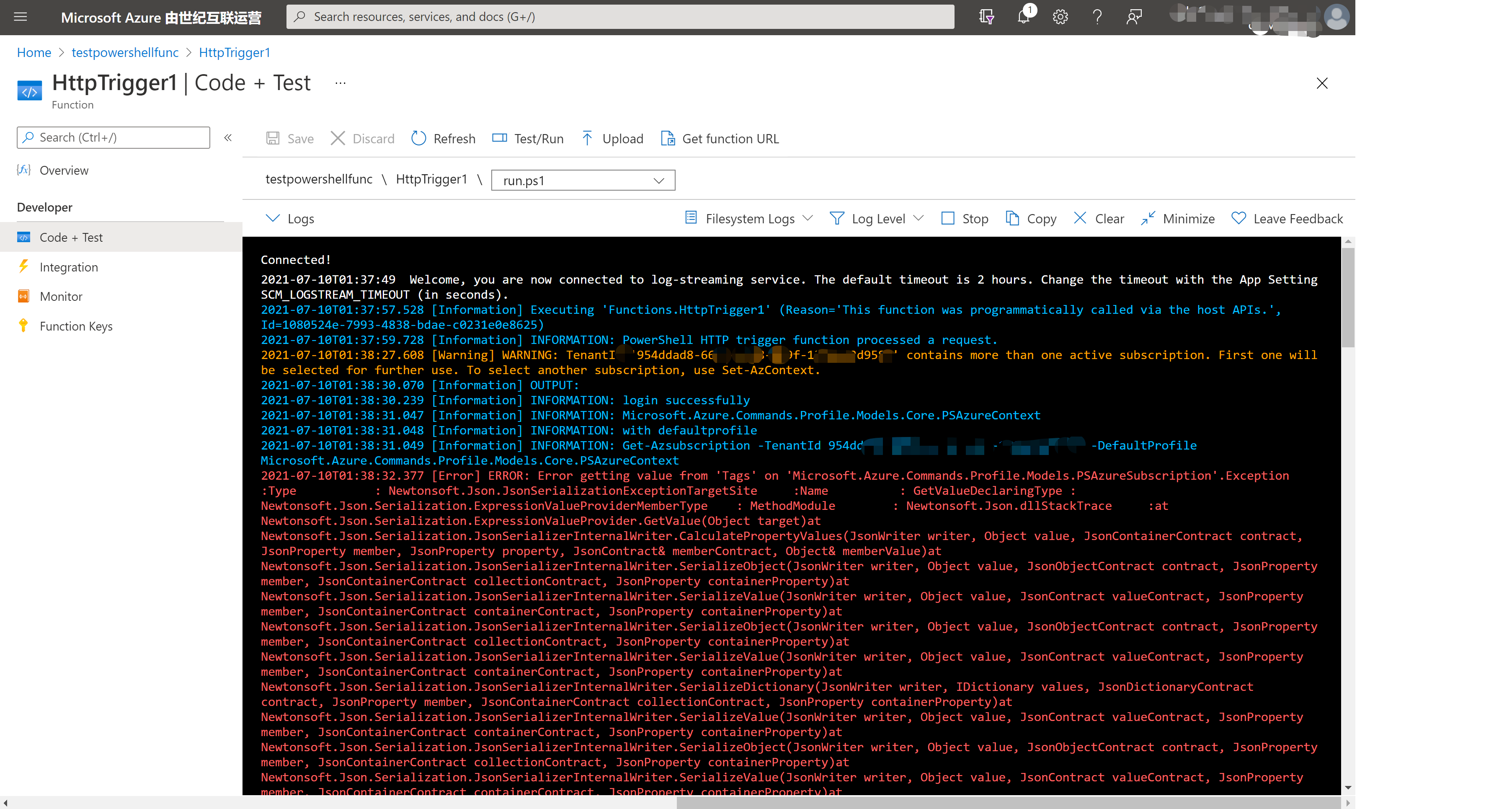 对比以上本地可以成功运行,而在Azure Function中确出现JSON格式解析错误,所以排查PowerShell脚本错误问题。 那么就定位在运行脚本的环境问题。