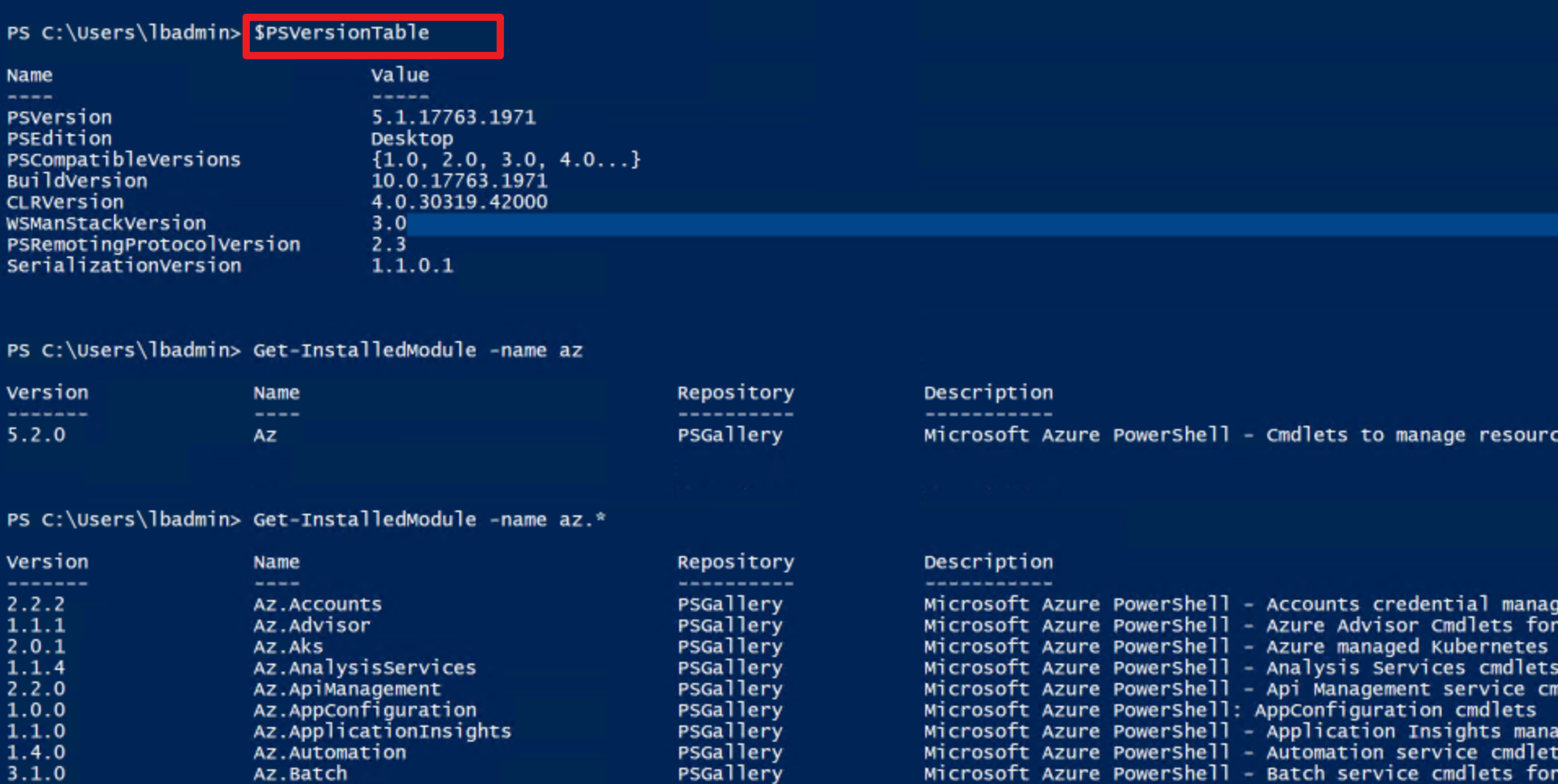 通过 $PSVersionTable 打出PowerShell版本,通过 Get-InstalledModule -name az 和 Get-InstalledModule -name az.* 打印出当前环境的版本号。