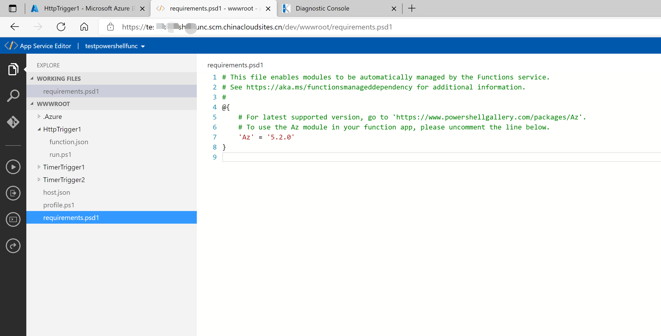 在Azure Function 门户页面,点击“App Service Editor (Preview)” 目录,进入Editor页面,在文件requirements.psd1文件中,修改az的版本号为5.2.0. 保存后,回到Azure Function页面。重启Function. 修改页面如下: