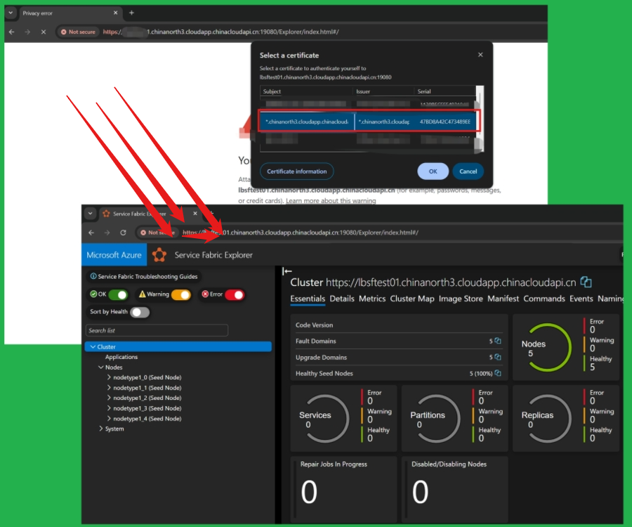 打开Service Fabric Explorer时,提示选择证书(即安装的客户端证书)。 如果选错了,则需要清空缓存或历史记录才能再次打开。或直接使用隐私模式。