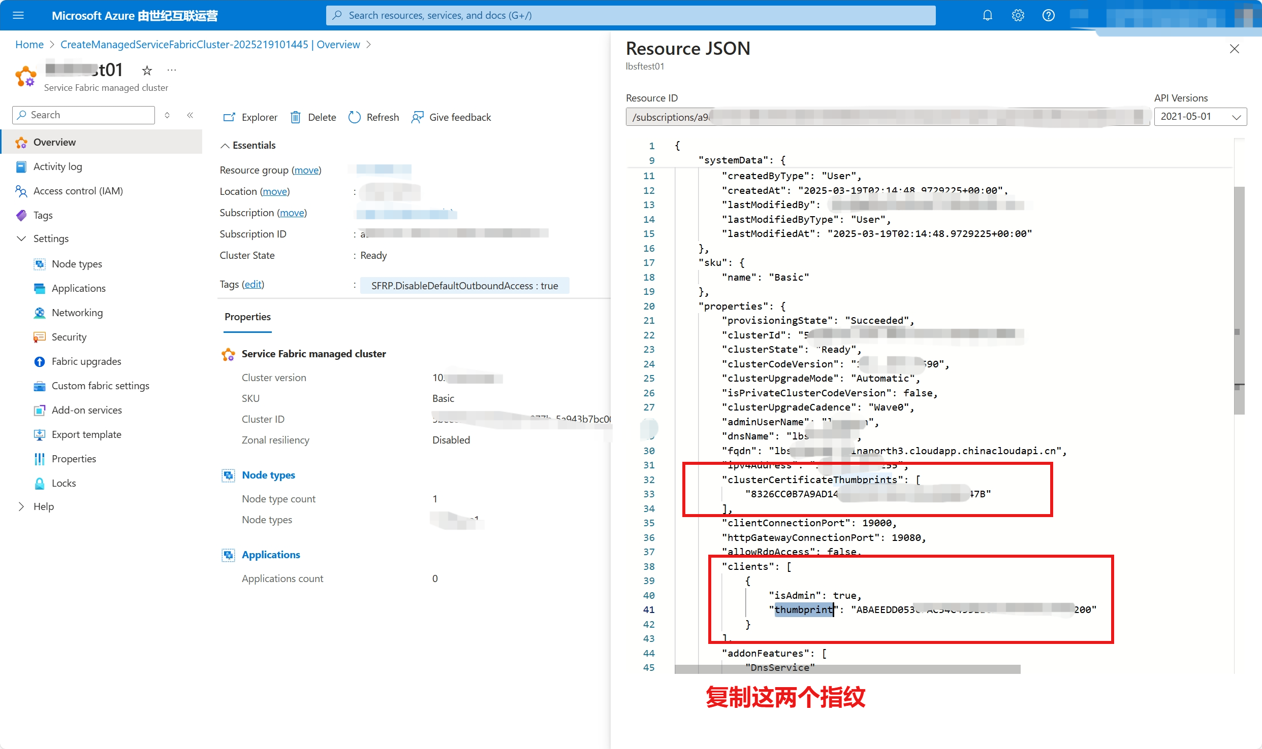 在Azure 管理门户中,同时获取这两个证书指纹值(Azure 门户 --> SF Overview页面 --> JSON View -> 查看 Properties 值), 复制如下两个属性值。