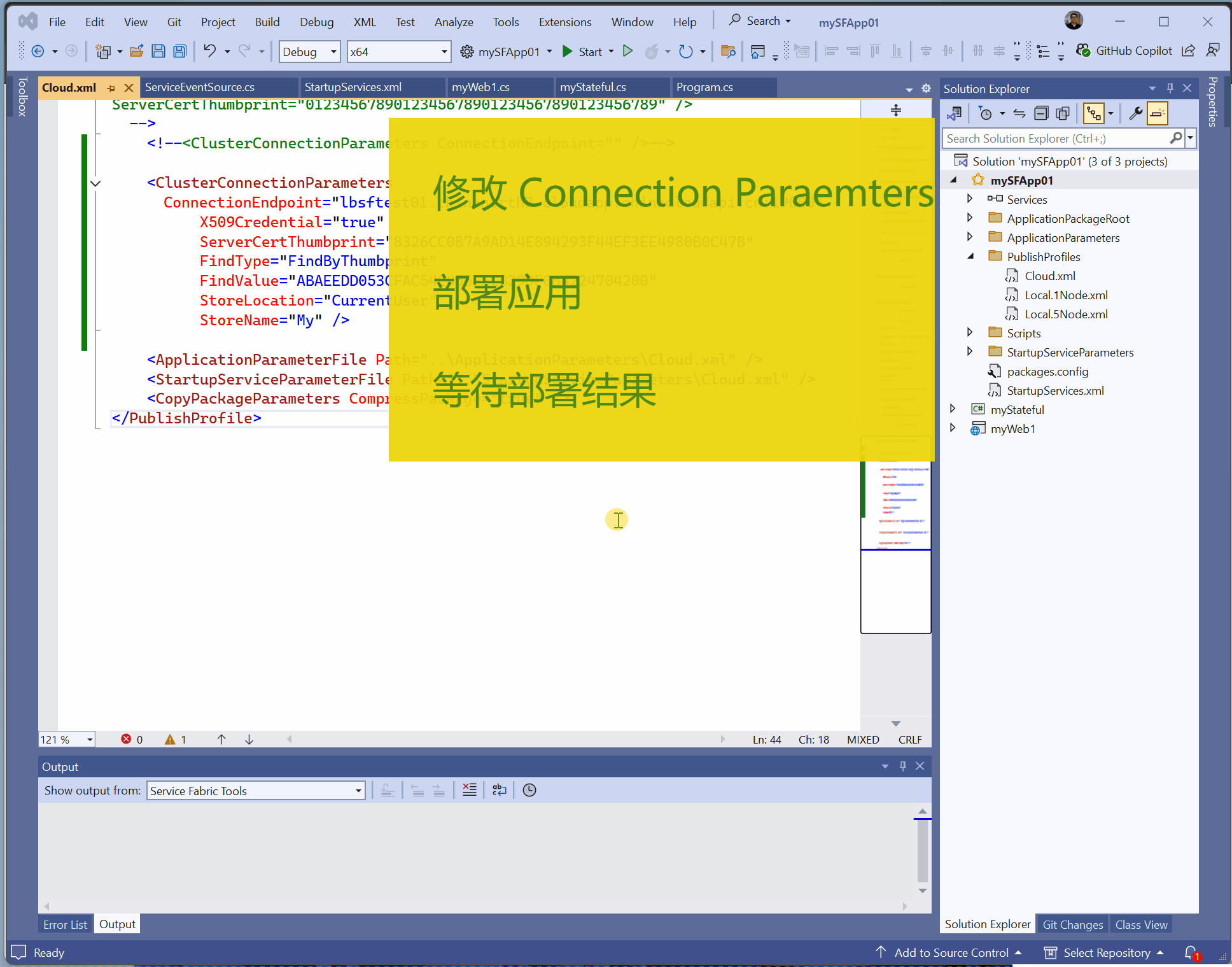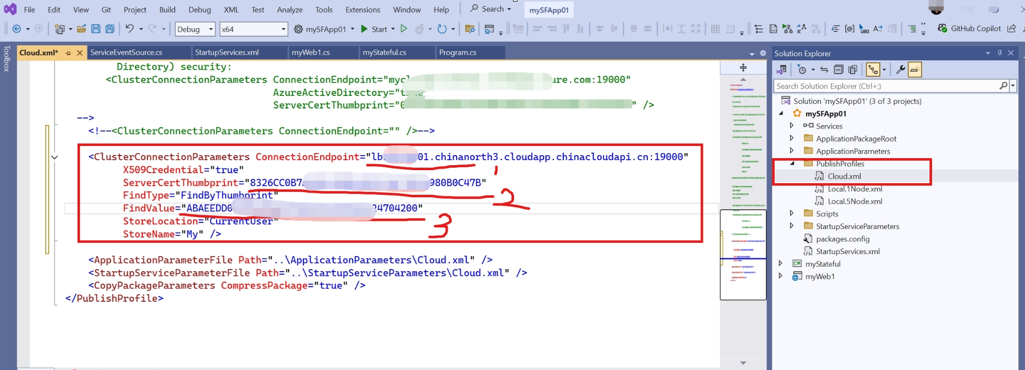 回归 Visual Studio 2022,打开项目文件 PublishProfiles --> Cloud.xml, 修改ClusterConnectionParameters内容: