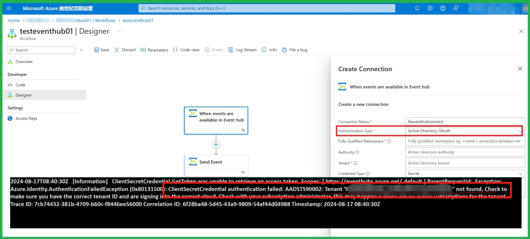 2024-08-17T08:40:30Z [Error] An exception occurred while retrieving properties for Event Hub: logicapp. Error Message: 'ClientSecretCredential authentication failed: AADSTS90002: Tenant 'xxxxxxxx-xxxx-xxxx-xxxx-xxxxxxxxxxxx' not found. Check to make sure you have the correct tenant ID and are signing into the correct cloud. Check with your subscription administrator, this may happen if there are no active subscriptions for the tenant.