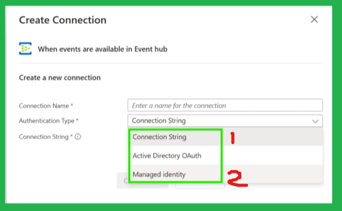 使用Logic App服务,创建Event Hub触发的Workflow。 根据以下信息配置Event Hub连接器的Active Directory OAuth认证方式: