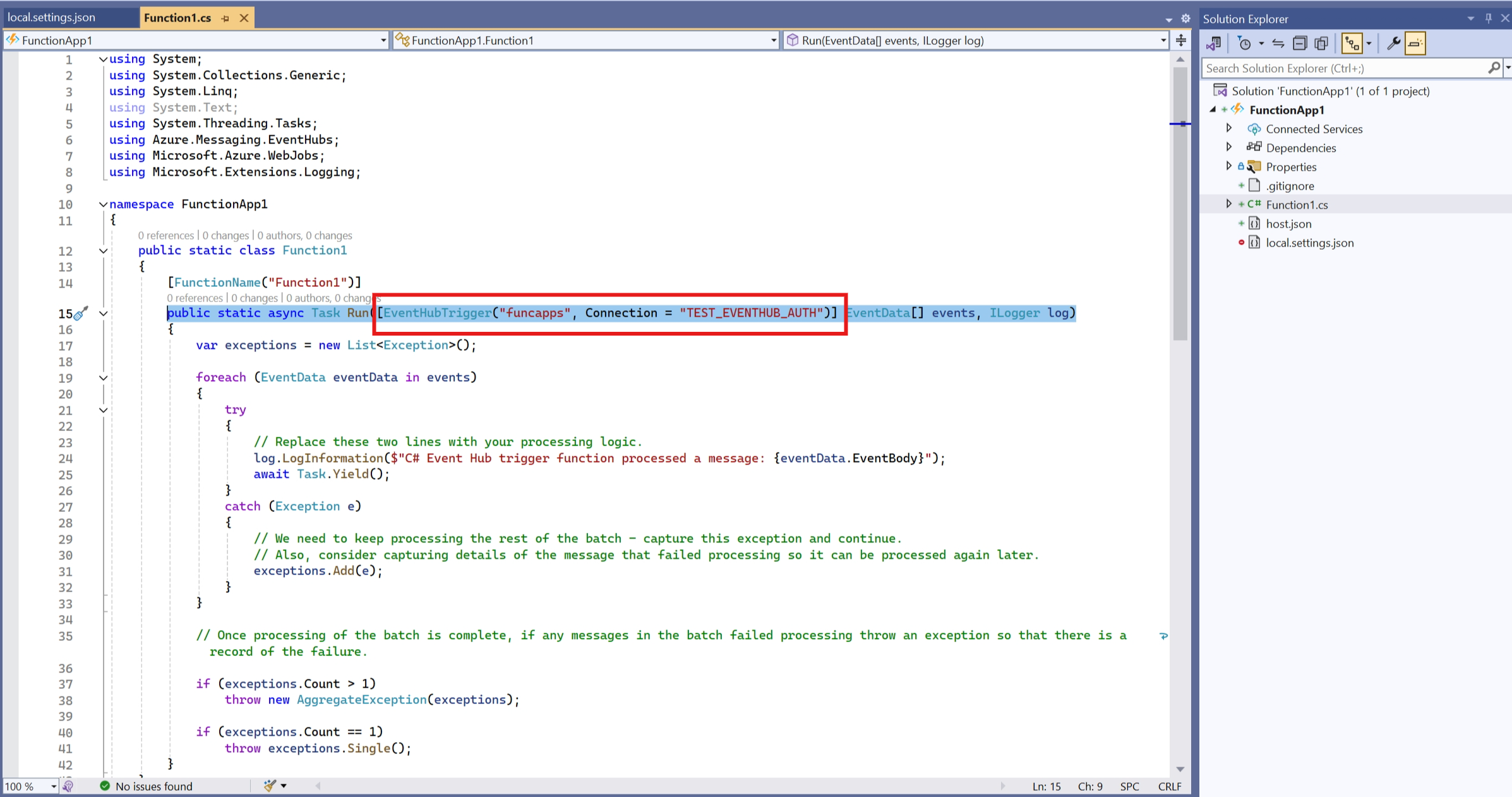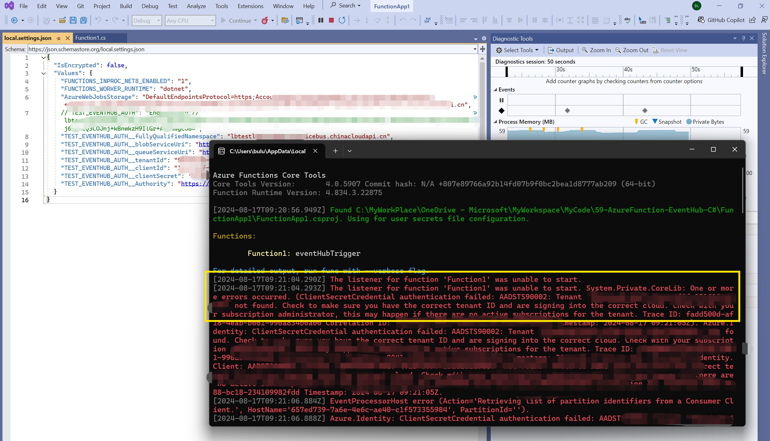 在 local.settings.json 文件中,用 TEST_EVENTHUB_AUTH__fullyQualifiedNamespace等系列配置 替换 TEST_EVENTHUB_AUTH 连接字符串。