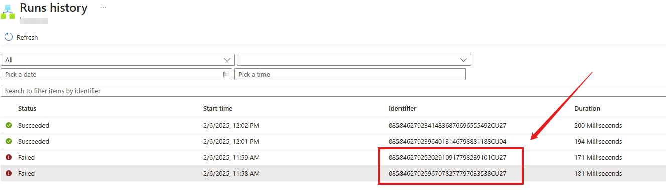 在出现问题时需要排查时,就可以通过日志记录来的关键信息过滤并查看对应的Logic App日志(另一个原因是因为Logic App的日志每次只显示40条,如果要查看过去很久的日志,通过Identifer关键字则非常方便)。
