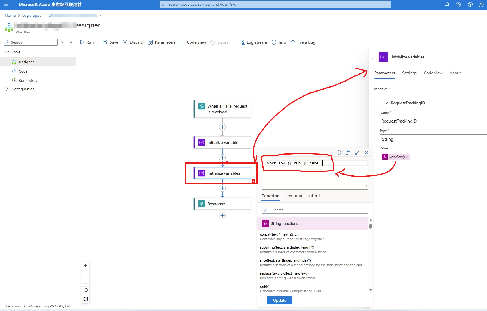 进入Logic App的Designer页面,添加一个Variablers,Value配置为 workflow()['run']['name'] ,用于获取本次执行Workflow的 Identifier。