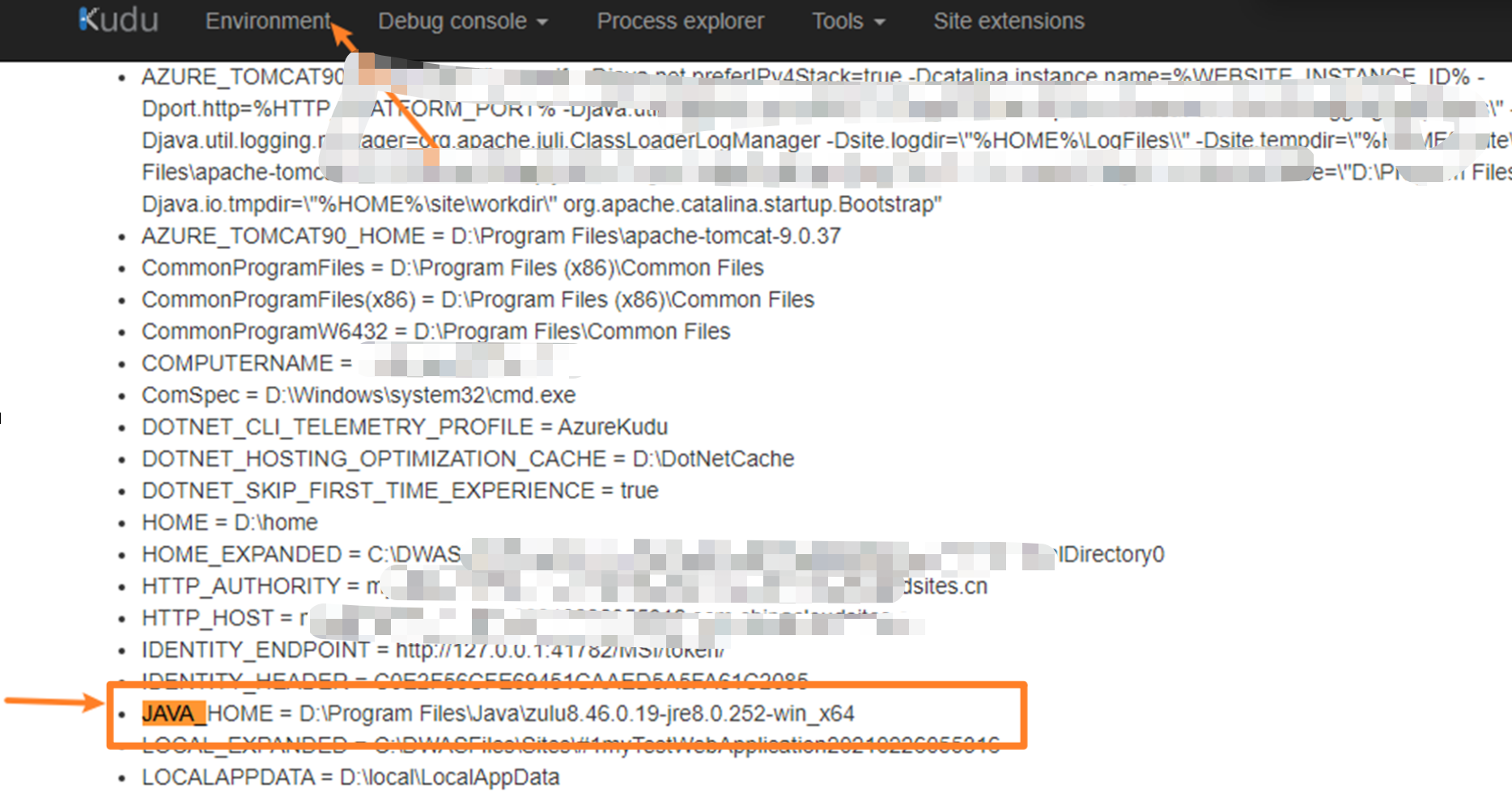 因为Java的DUMP文件需要在JDK的运行环境中才能通过 jstack 命令来抓取,而App Service默认使用的是 jre。在App Service的高级管理工具(Kudu)可以查看到当前的Java_Home查看到所使用的Jre版本。