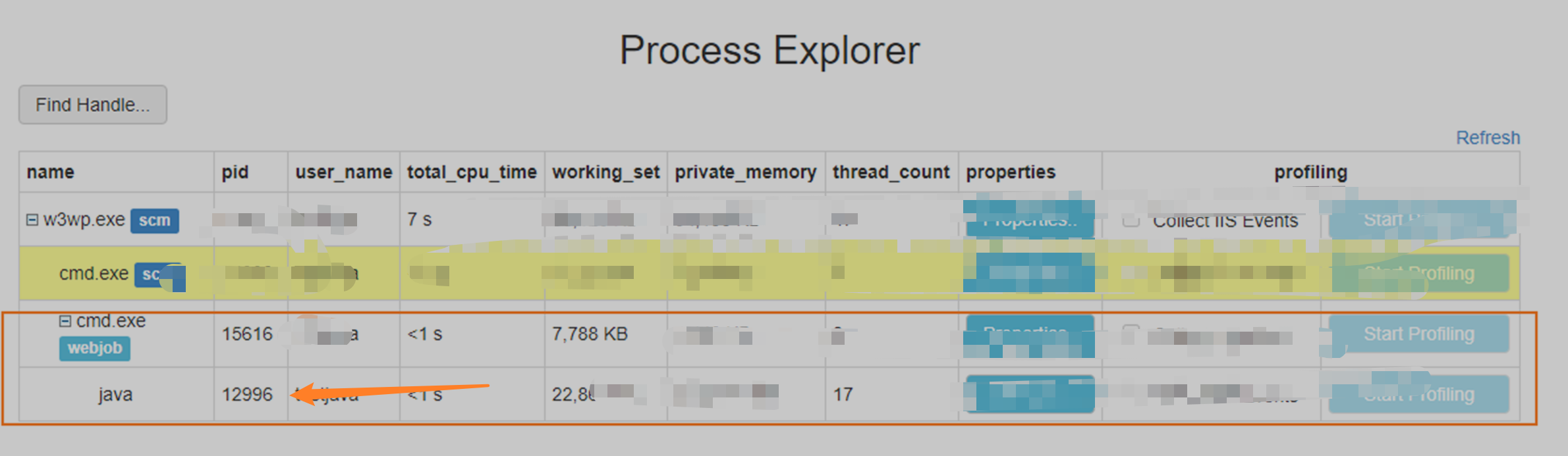 **第二步:**等待 .jar Web Job运行后,到进程浏览器中查询相关java进程的id (注意是web job的javb 进程)。