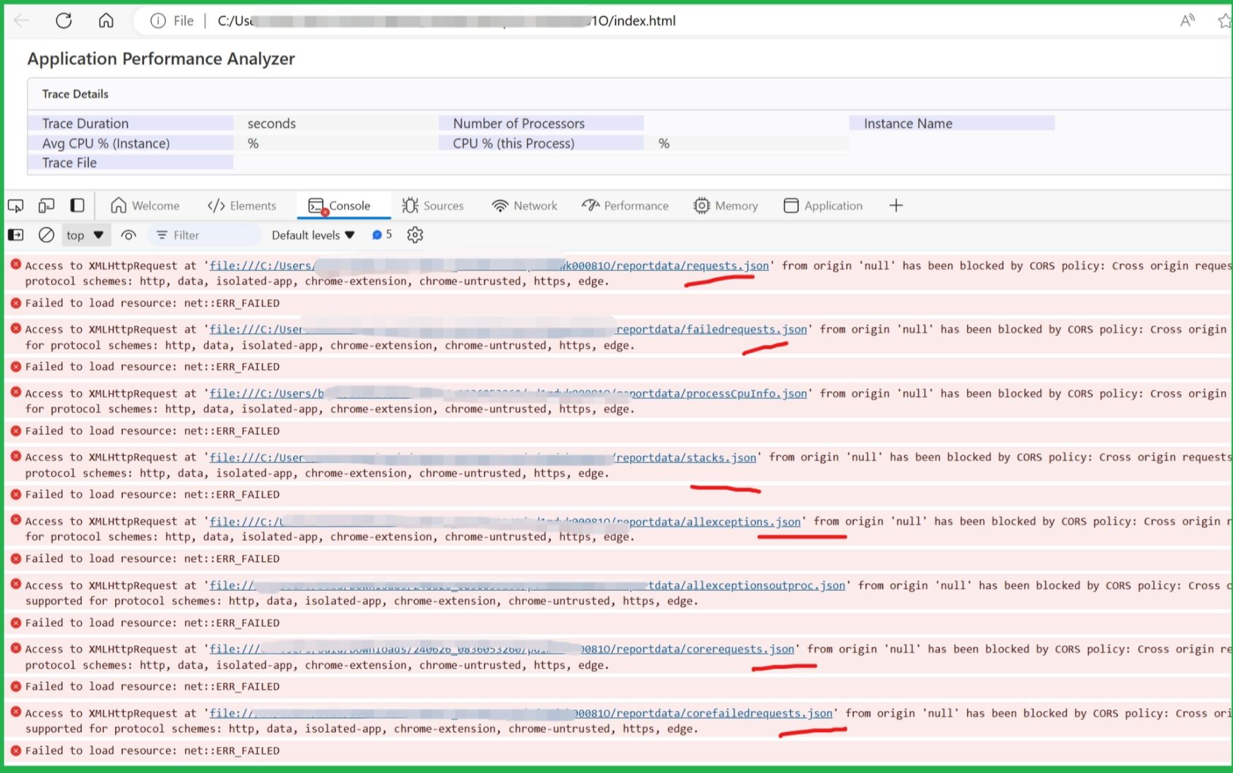 .Net 应用部署到Azure App Service上后,出现5XX错误后,通过.Net Profiler Trace工具生成报告文件(HTML 加 JSON数据文件),在本地打开,遇见Access to XMLHttpRequest at 'file:///C:/Users/.../failedrequests.json' from origin 'null' has been blocked by CORS policy 问题