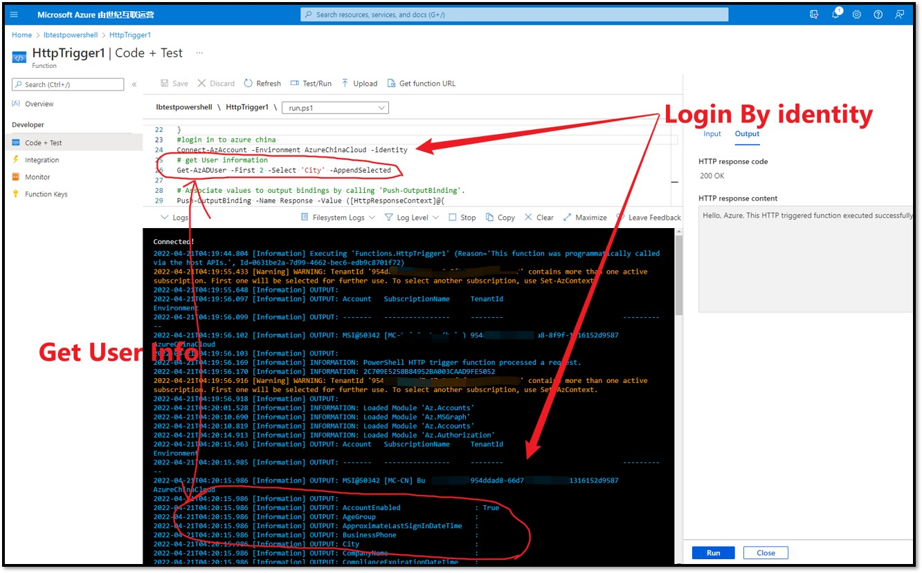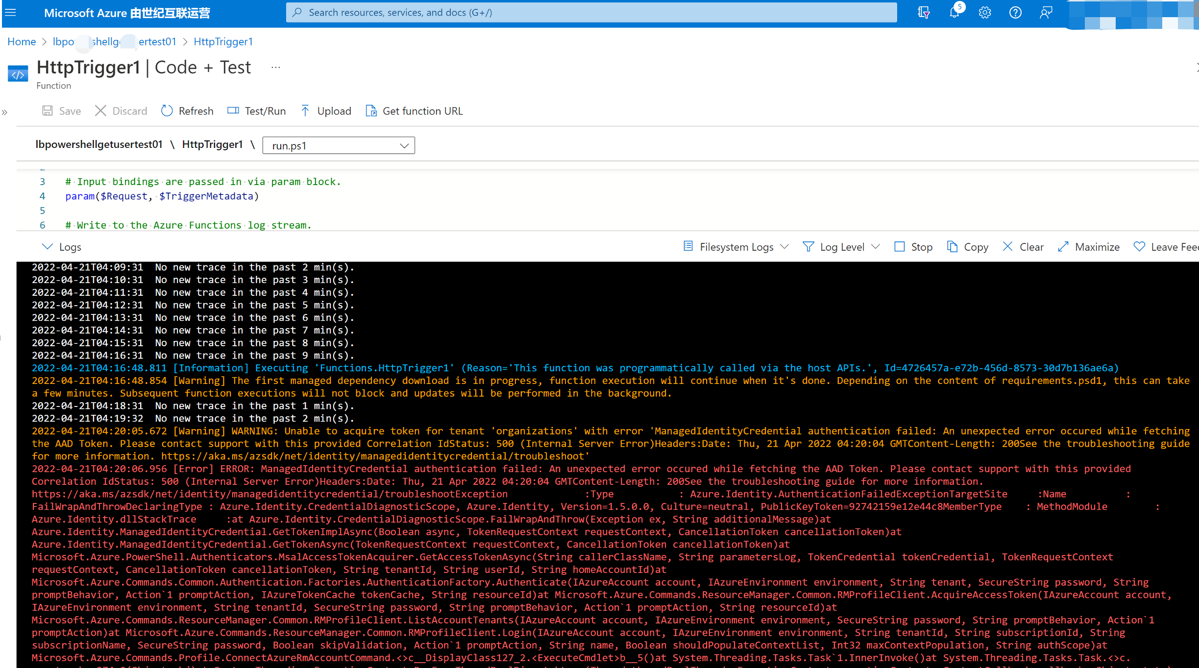 编写Powershell Function,登录到China Azure并获取Azure AD User信息,但是发现遇见了 [Error] ERROR: ManagedIdentityCredential authentication failed: An unexpected error occured while fetching the AAD Token. Please contact support with this provided Correlation IdStatus: 500 (Internal Server Error) 。