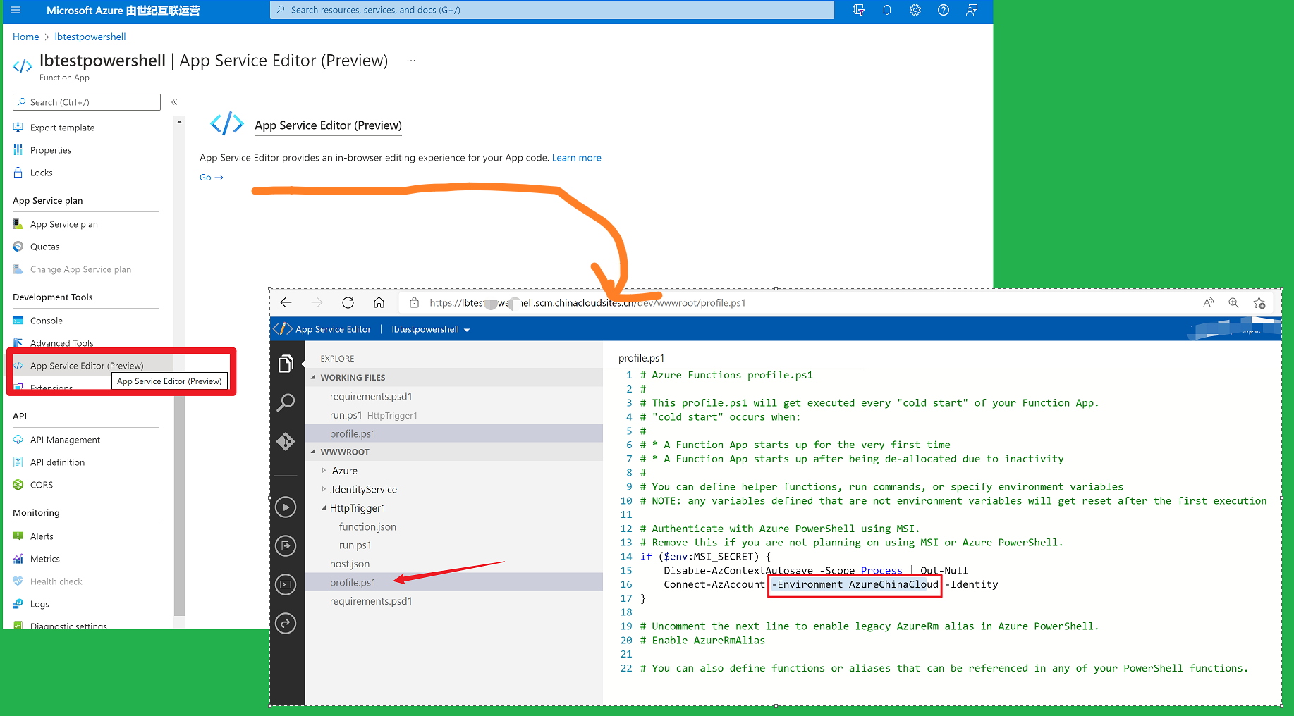 在Function App页面中,点击App Service Editor, 修改 profile.ps1 文件。