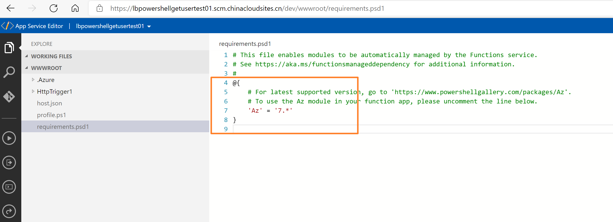 注:为了是的Connect-AzAccount成功运行,需要在requirements.psd1中添加 'Az' = '7.*' ,使得Function App的实例安装好Az模块。当然,如果Function中需要其他的Powershell模块,在这里添加即可。