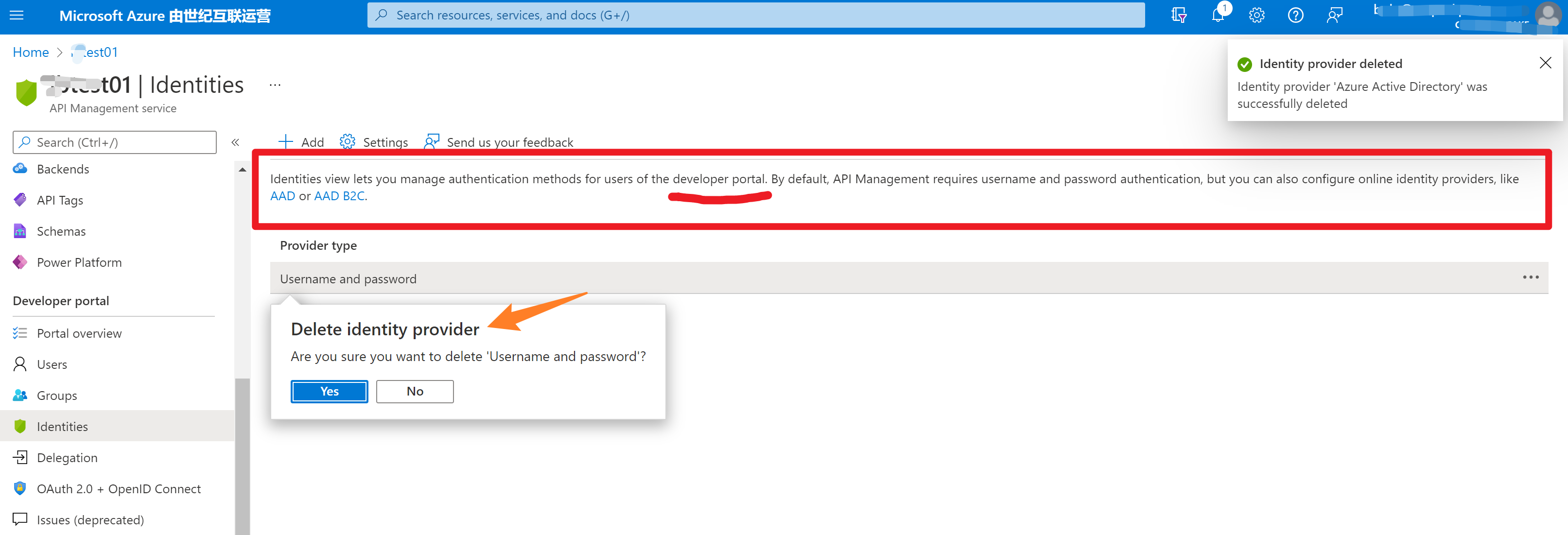 通过删除所有标识类型来禁用注册(这可以在 Azure 门户中完成 - 选择 API 管理实例,然后单击"标识"并删除每个标识类型)。