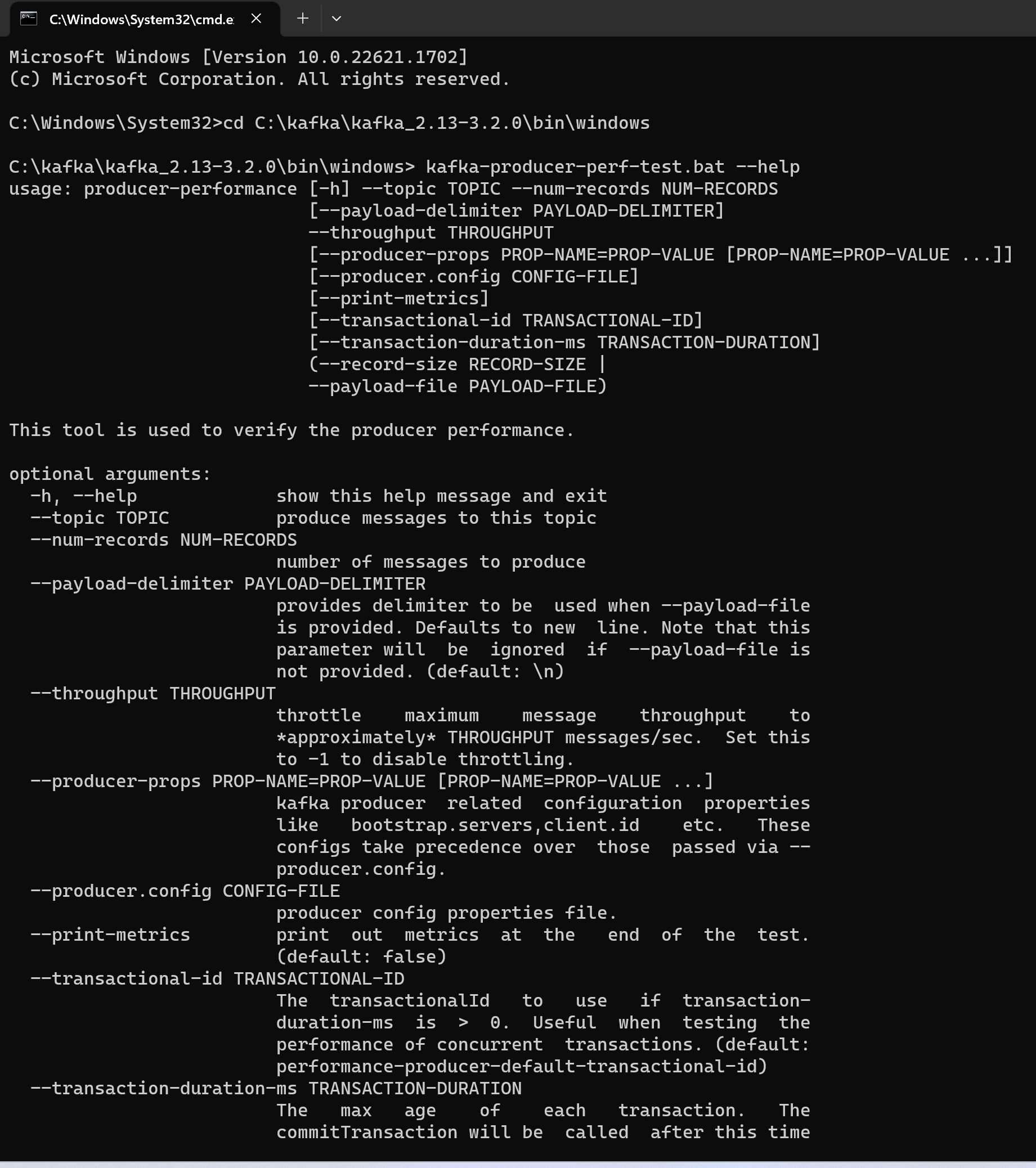 第二步:通过CMD,执行 ” kafka-producer-perf-test.bat --help ” 来查看指令的参数