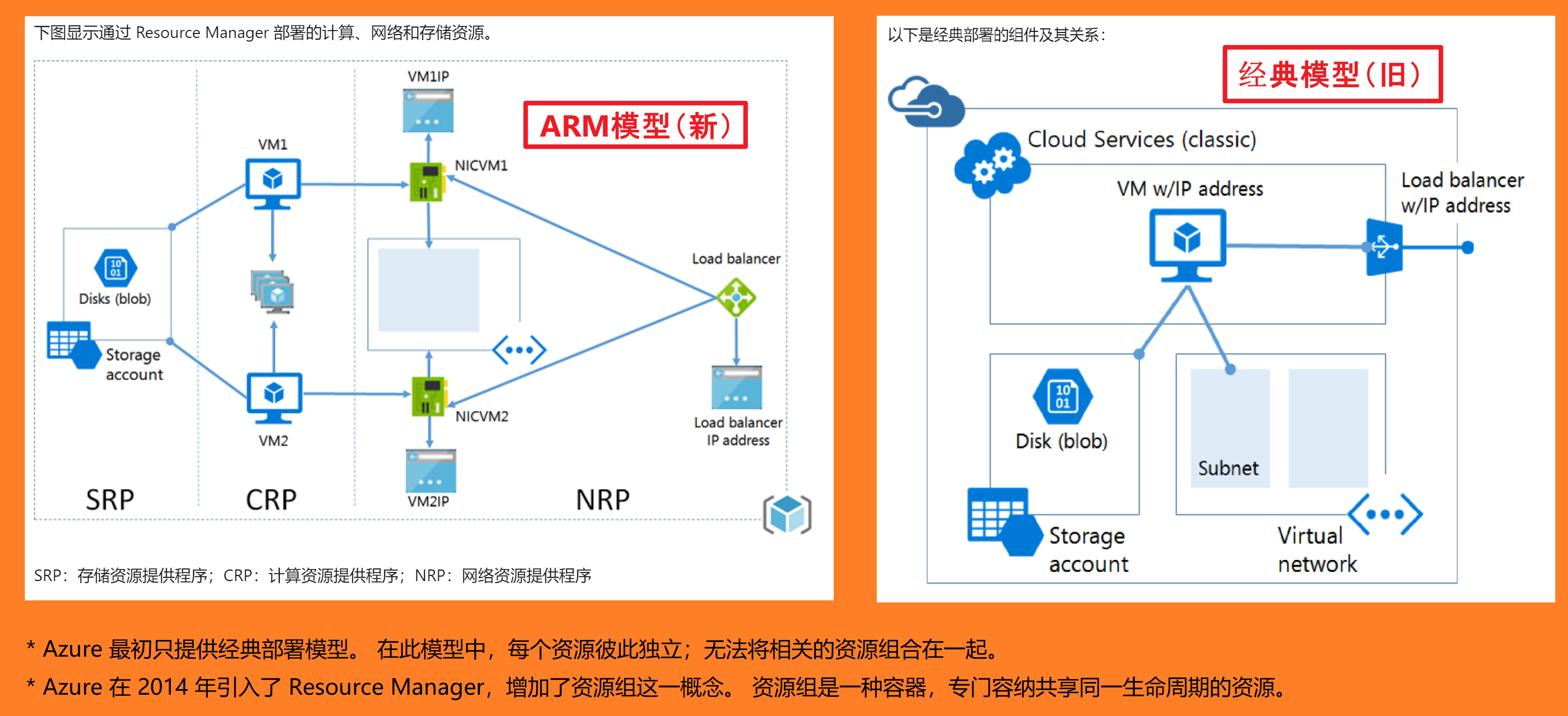 到2021年,经历了11年的发展,其中的架构也经历了大的变动,最明显的就是从最早的经典模式到目前的ARM(Azure Resource Manager)模式,这两中模式简单区别的模式图如: