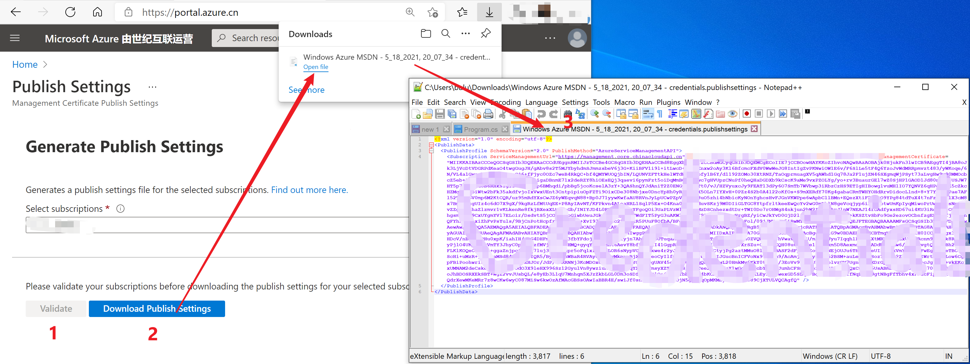 选择第一步中设置的订阅账号,点击Validate按钮,然后Download Publish Settings。下载的即是在第三步API调用中所需要的证书文件