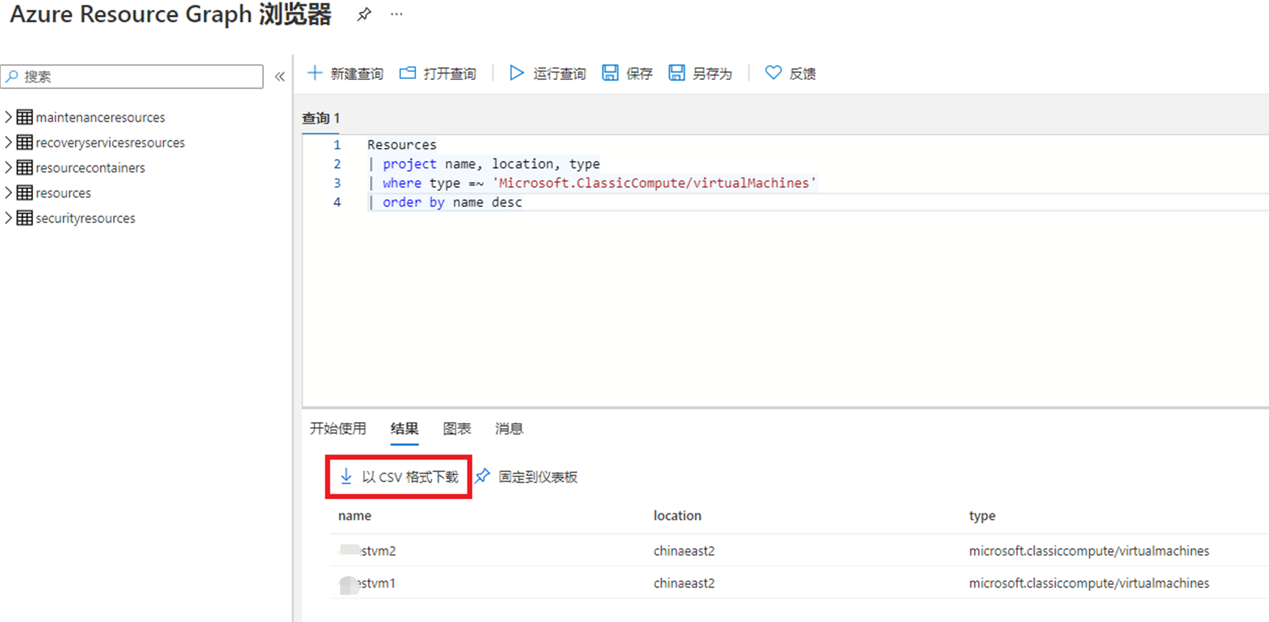 附录一:在Azure 门户中使用Azure Resource Graph快速查看经典虚拟机列表(无代码),然后另存为本地文件。