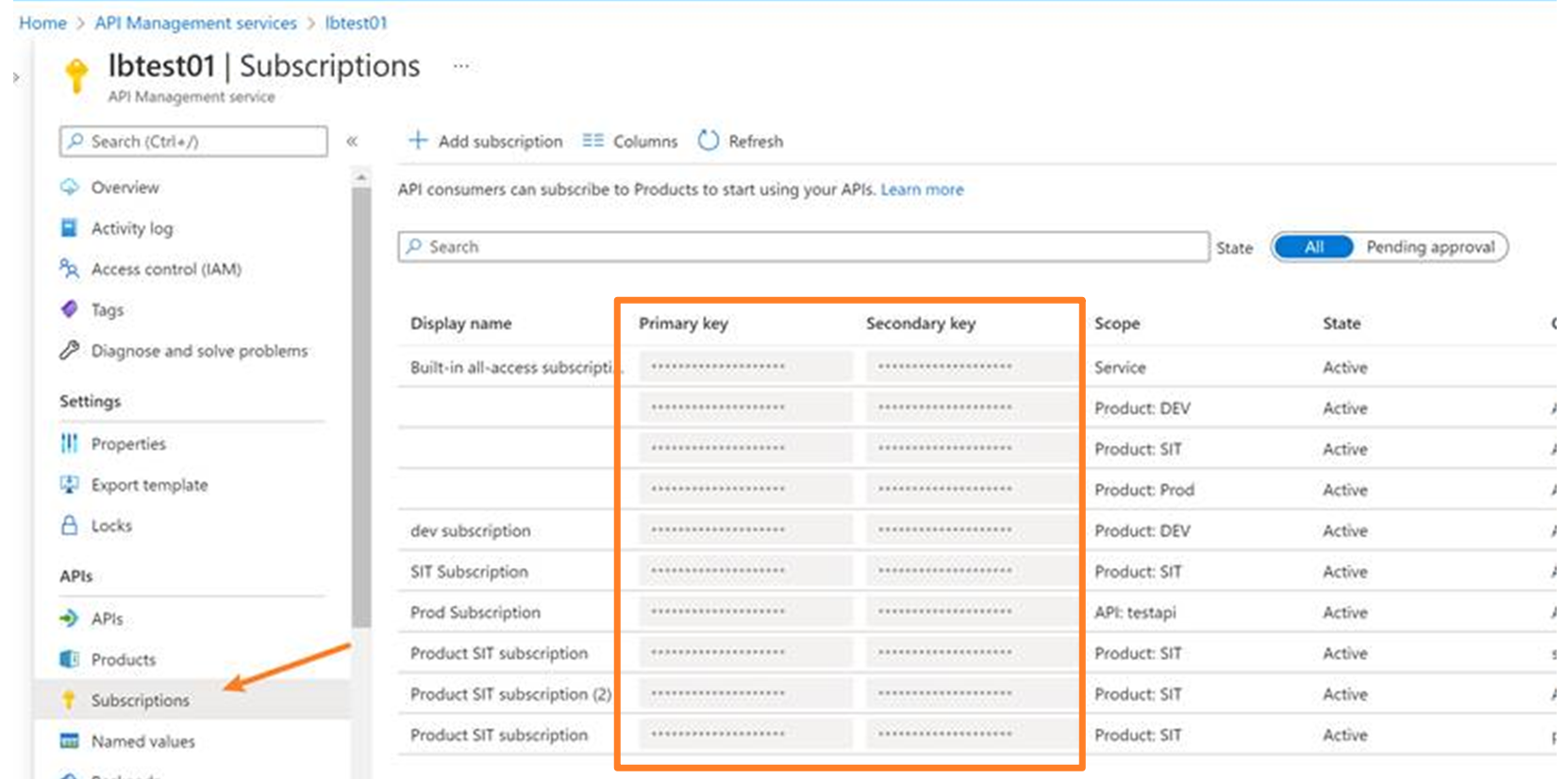 登录Azure APIM门户 --> 进入左侧 Subscriptions目录,在Subscriptions 列表中选择与当前使用API对应的Subscription Key