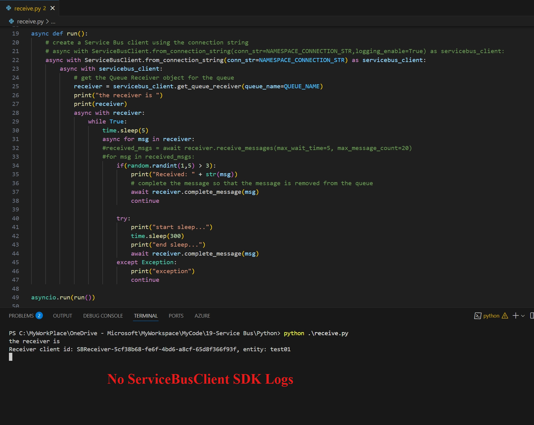 async with ServiceBusClient.from_connection_string(conn_str=NAMESPACE_CONNECTION_STR,logging_enable=True) as servicebus_client:
