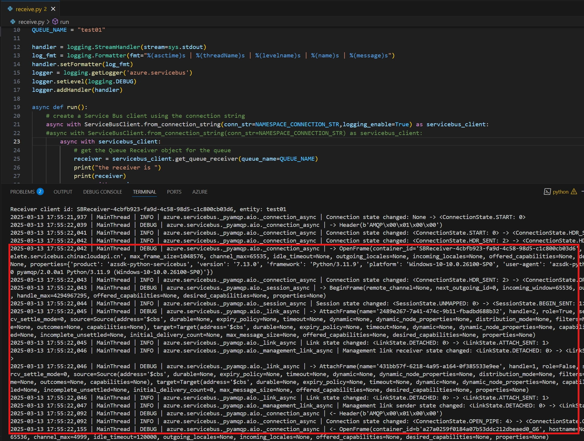 logger = logging.getLogger('azure.servicebus')