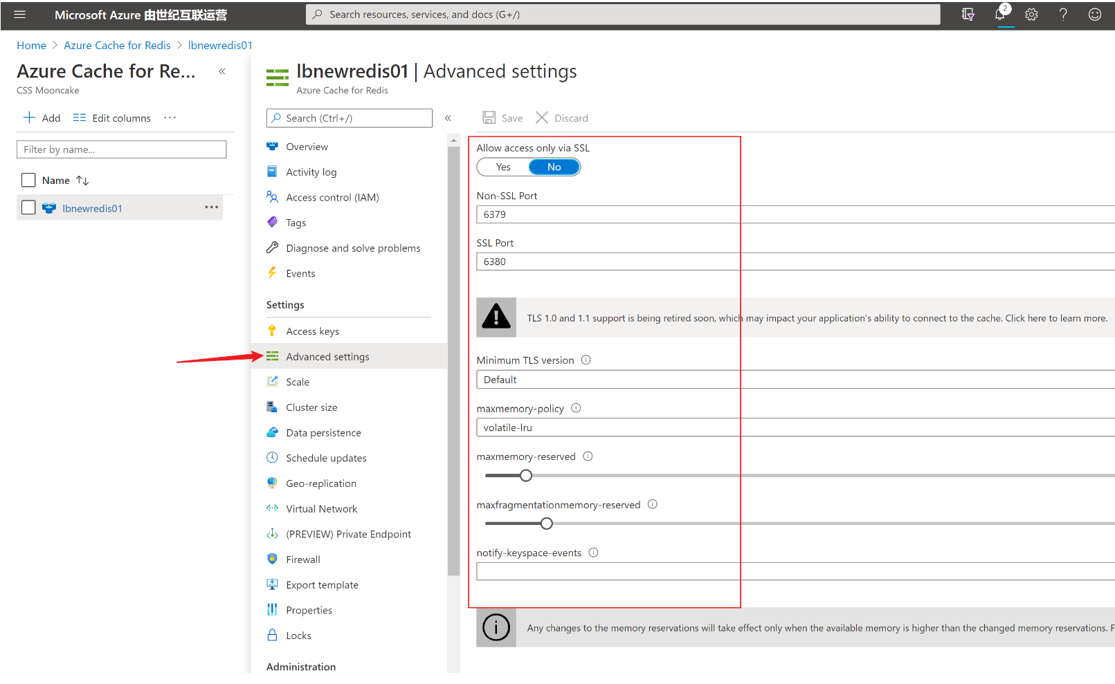 二:Azure Redis禁止使用config命令。只能通过门户上的Advance Settings来配置Redis的一些设置。