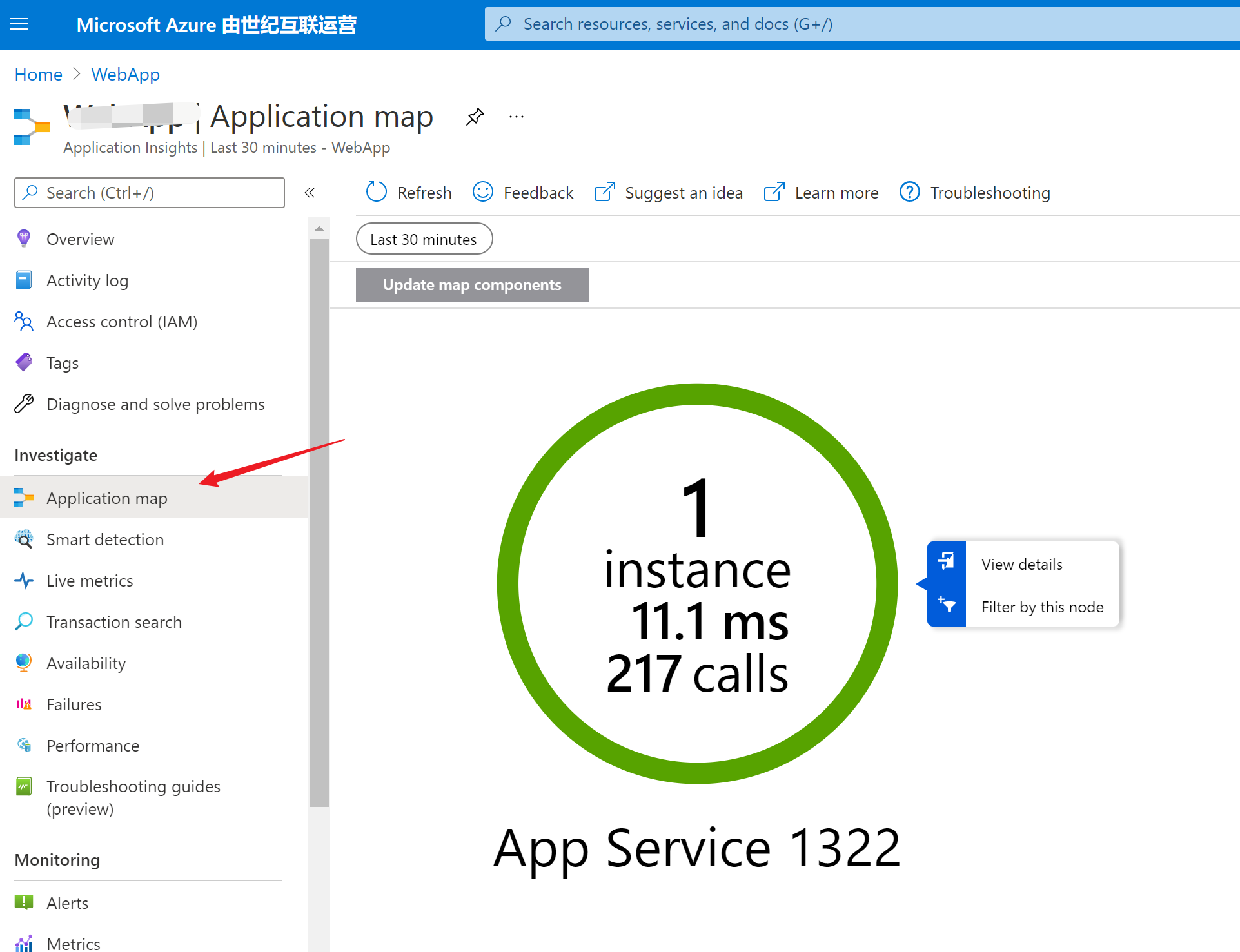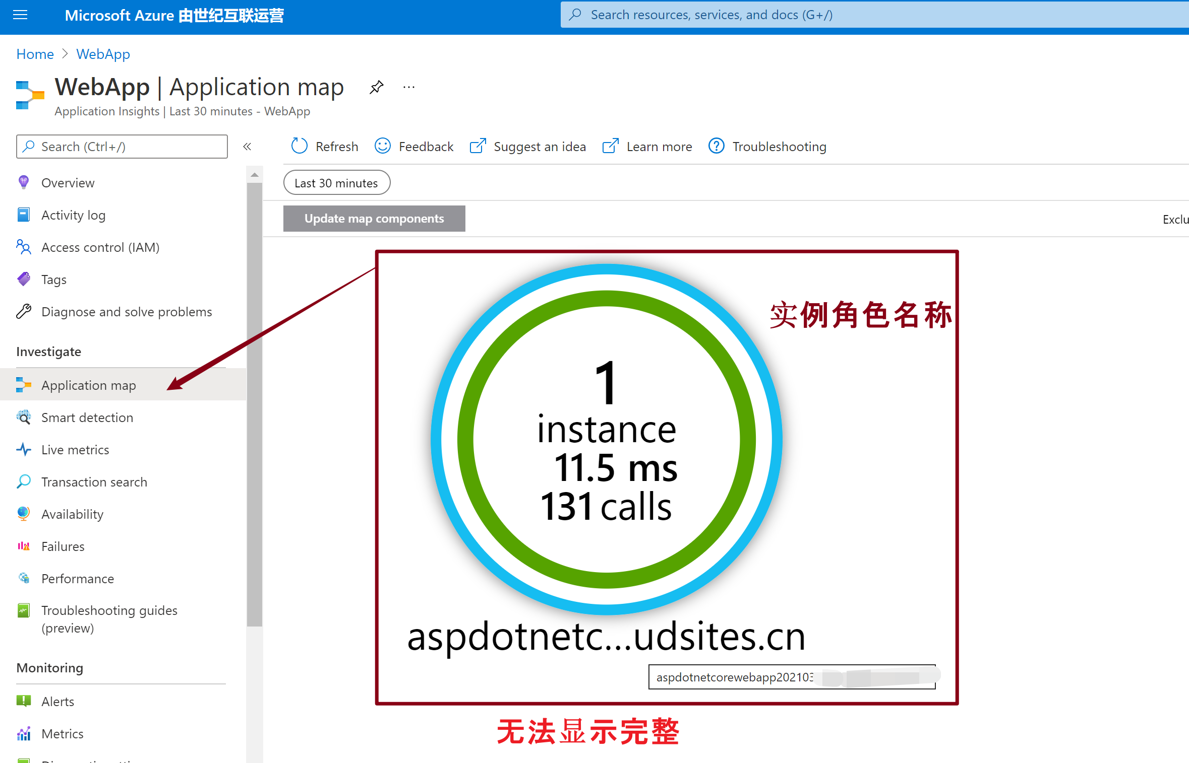 返回到Applicaiton Insights页面,查看Applicaiton Map页面,即可看见实例名称已经修改成功。