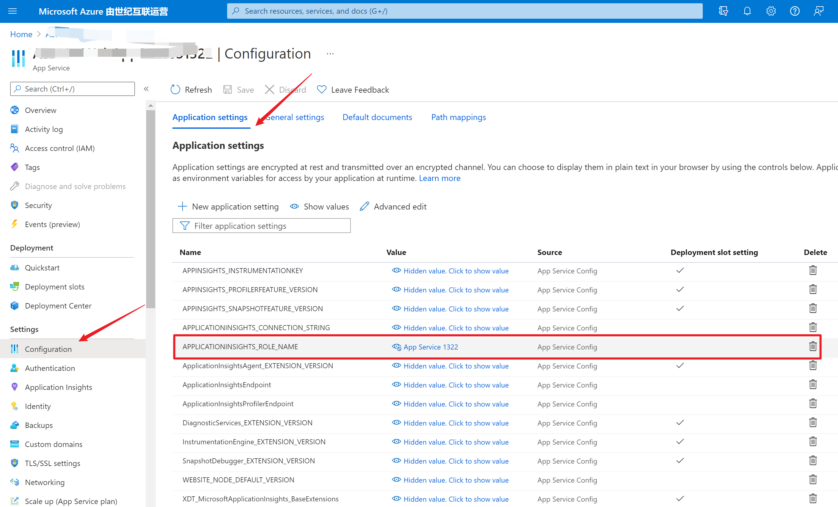 在App Serice的配置页面,添加名为 APPLICATIONINSIGHTS_ROLE_NAME 的配置项,它的值就是需要显示在Application Insights中的内容。