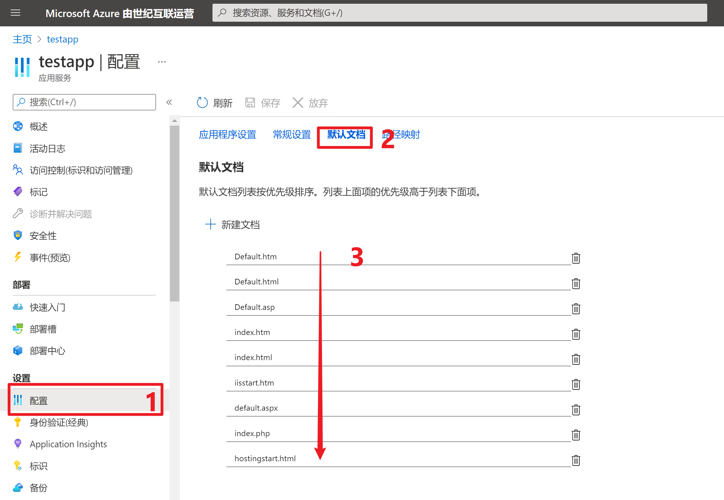 在部署时,可以保留hostingstart.html文件,也可以删除它。然后在wwwroot目录中包含 Default.htm, index.html 等文件即可。也可以自定义首页文件,可在App Service门户的配置 -> 默认文档一栏中设置。