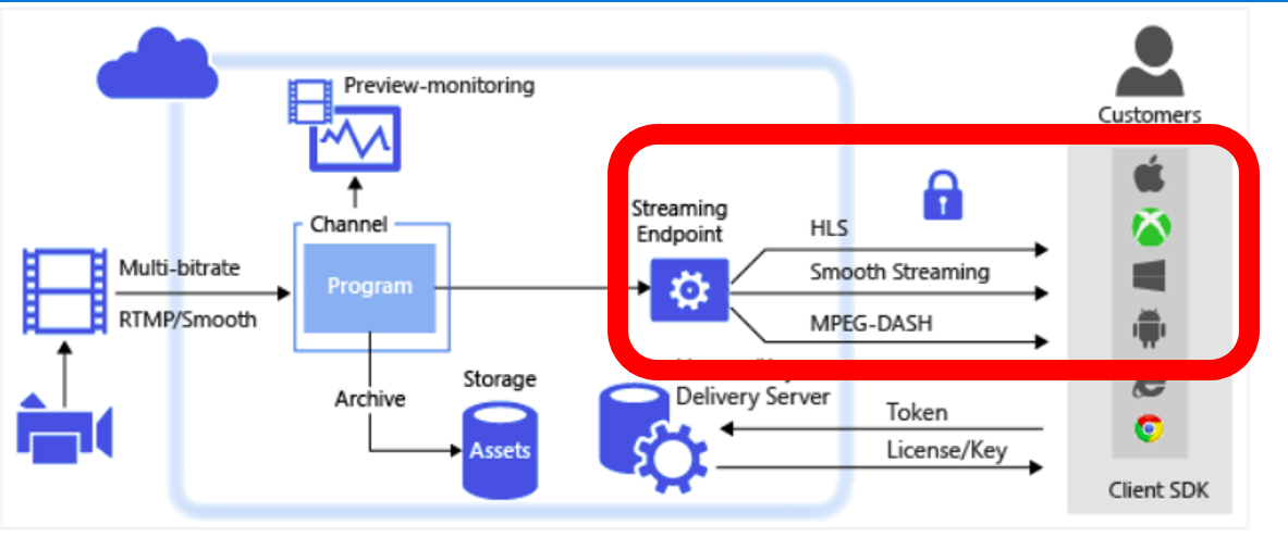以上内容简单列举了Azure媒体服务的两种方式的步骤,下面的内容则主要介绍 流式处理终结点(Streaming Endpoint ),流式处理终结点处于媒体服务的第三部分 --- 拉流端。 如图: