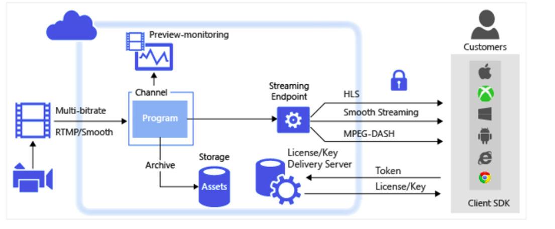 如Azure Media Player 直播的过程和结构图如下: