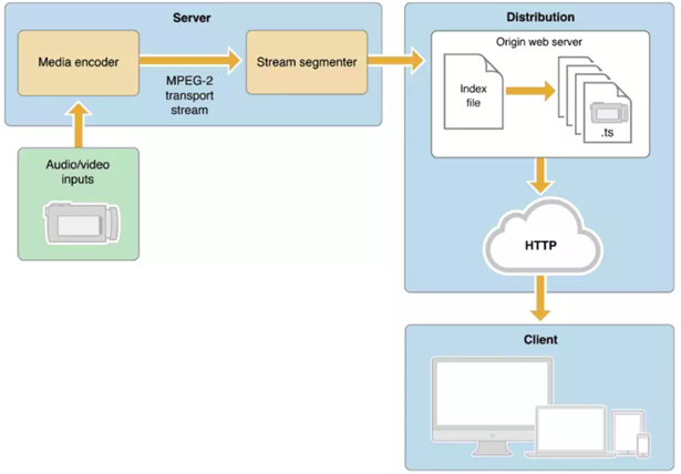 是由苹果公司提出的基于HTT的流媒体网络传输协议, 是把整个流分成一个个小的基于HTTP的文件来下载,当媒体流正在播放时,客户端可以选择从愈多不同的备用源中以不同的速率下载同样的资源,允许流媒体适应不同的数据速率。拓扑图如下: