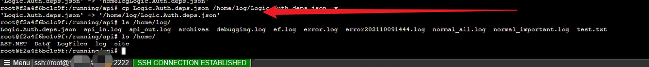 1) 首先,进入SSH窗口,在 /running/api目录中 cp 一个json文件到 /home/log目录下。 命令为: cp logic.auth.deps.json /home/log/logic.auth.deps.json