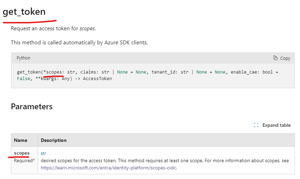 以上代码按照python常规的方式,为传递的参数指定参数名,根据ClientSecretCredential get_token方法介绍,参数名就是 scopes 。