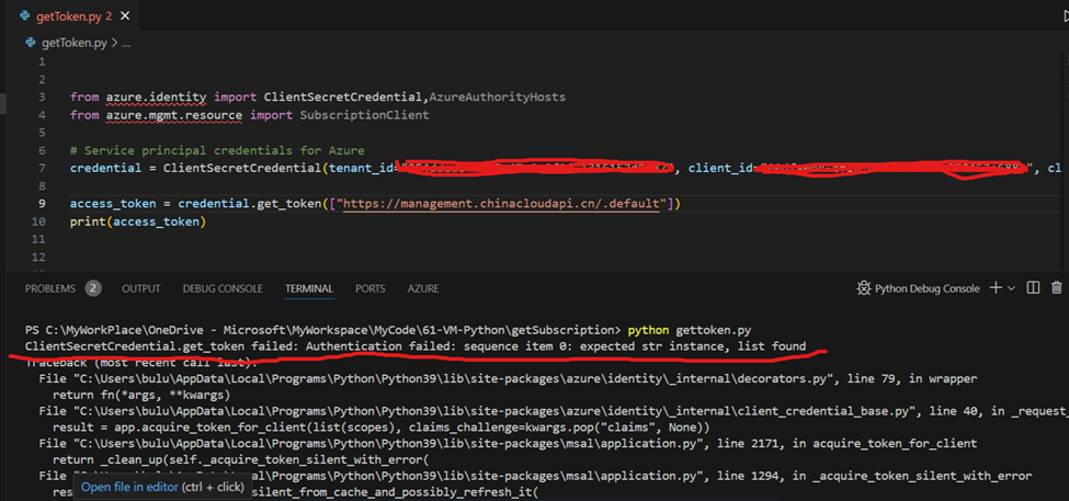 ClientSecretCredential.get_token failed: Authentication failed: sequence item 0: expected str instance, list found