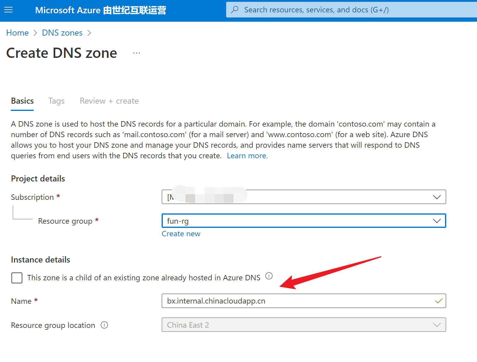进入DNS zones - Microsoft Azure 由世纪互联运营,创建名为 bx.internal.chinacloudapp.cn的DNS Zone资源