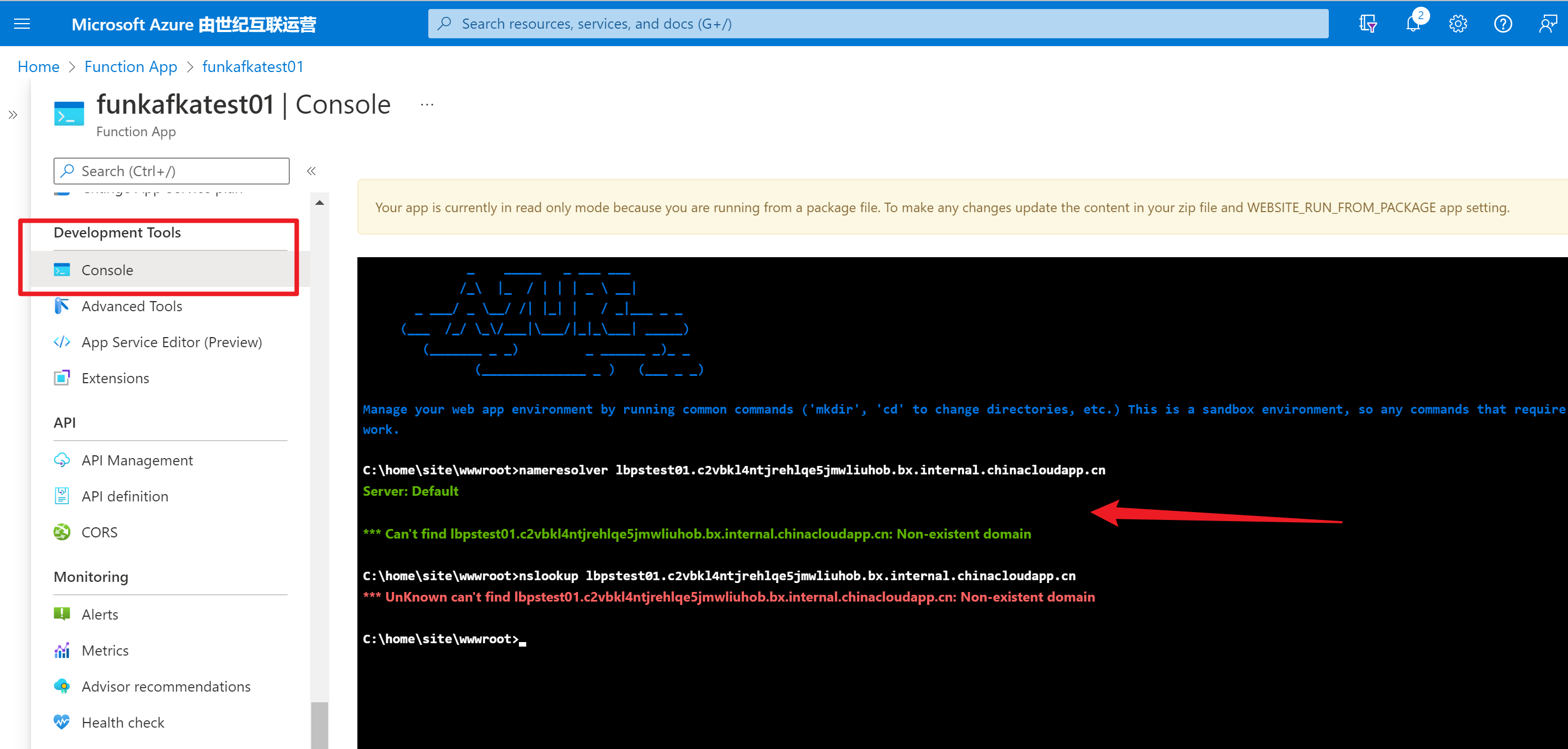 为了能够让Azure Function能够解析 *****.c2vbkl4ntjrehlqe5jmwliuhob.bx.internal.chinacloudapp.cn 的私有域名,就需要找一个自定义的DNS服务器,然后在Function中配置 WEBSITE_DNS_SERVER,用指定的DNS 服务器来解析私有域名。