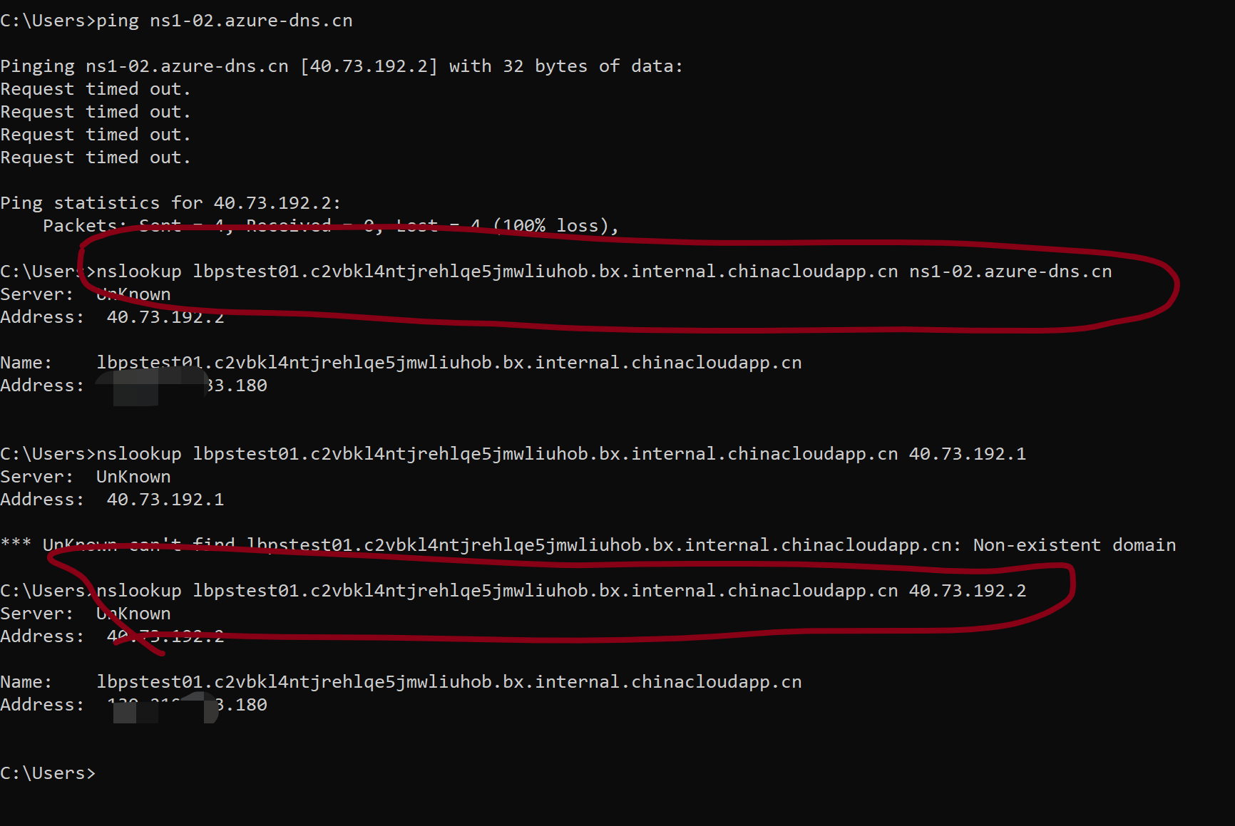 通过 nslookup 指定DSN解析服务器为 ns1-02.azure-dns.cn 成功解析kafka域名, 因为Azure Funciton WEBSITE_DNS_SERVER 只能设置为IP地址,所以需要找出ns1-02.azure-dns.cn的IP地址