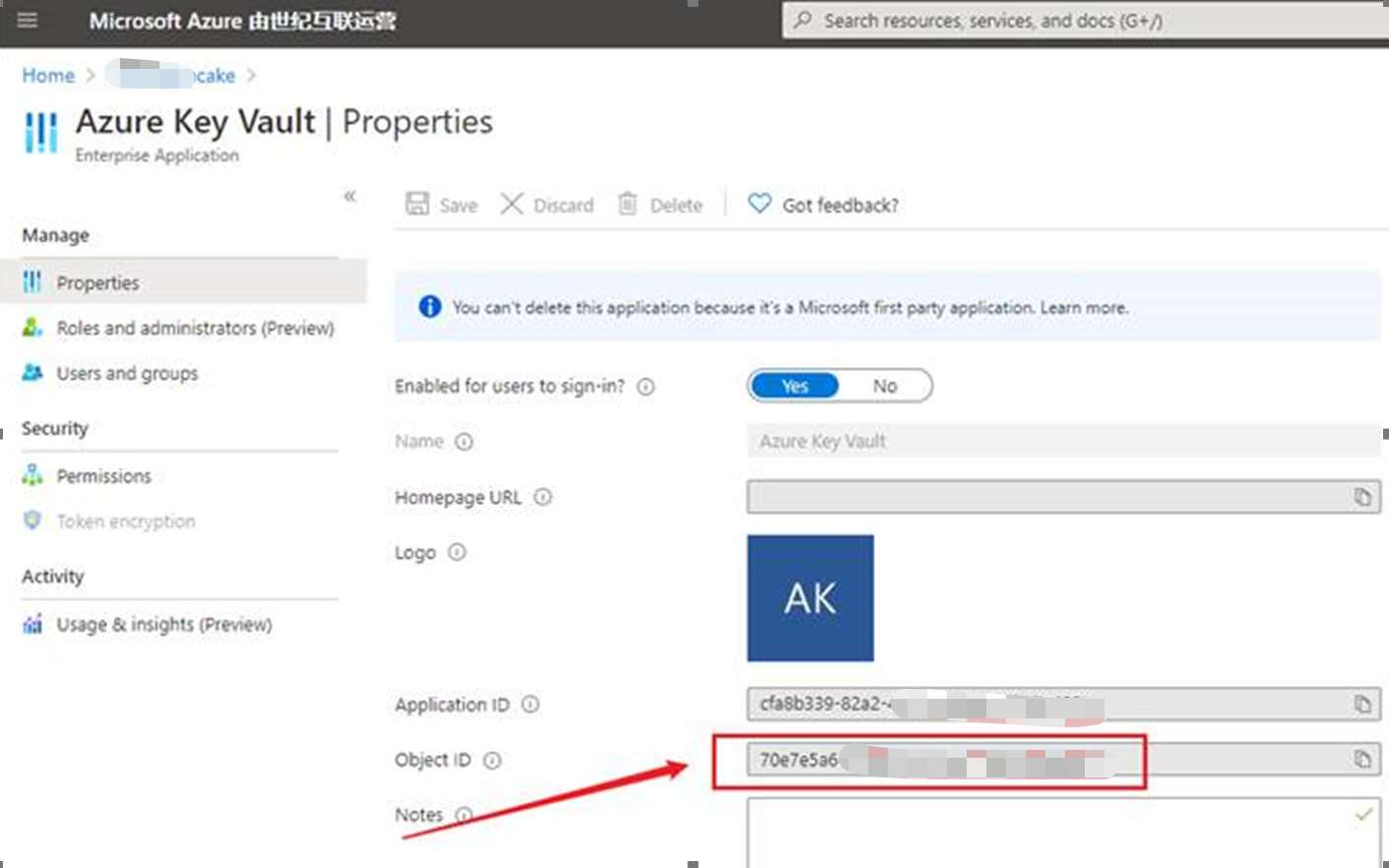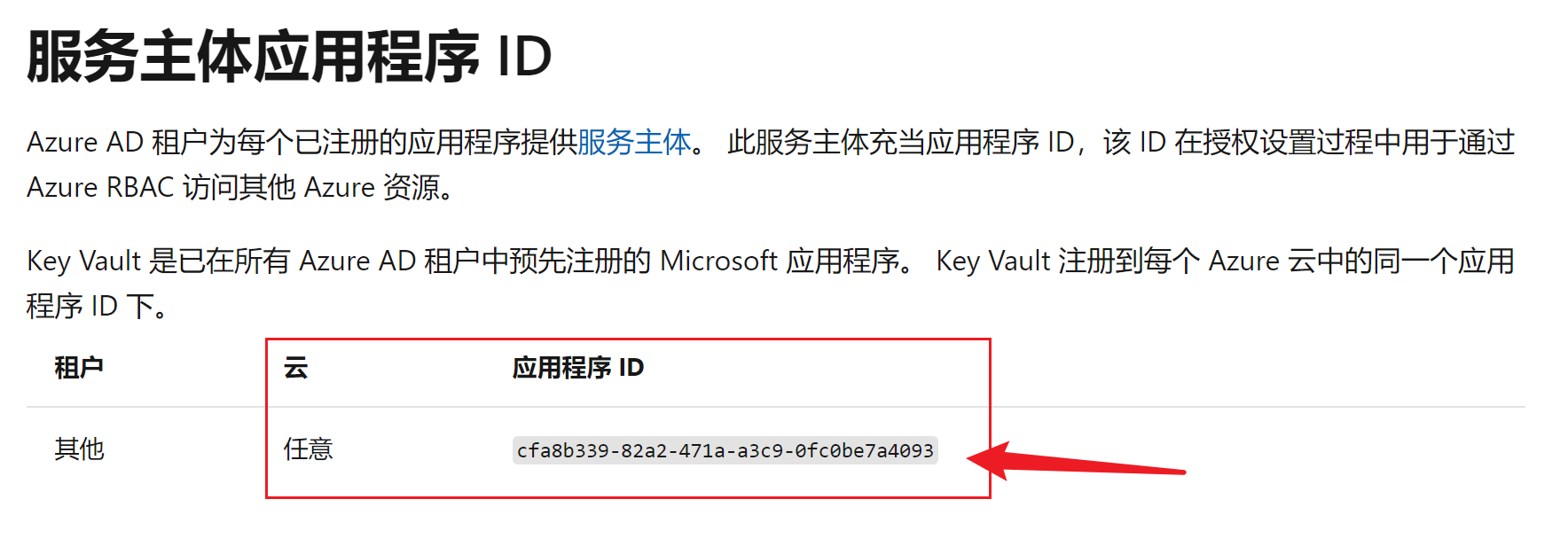文档描述错误,Azure中国云为Key Vault注册的对象ID(Object)并不是固定不变,在每个不同的租户下,其值不同。只有Key Vault中Application ID保持不变。正如文档中描述的: