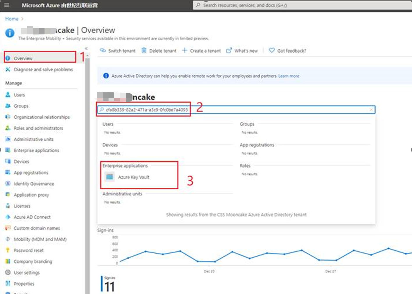 第一步:进入Azure AD, 在overview页面搜索key vault的application id(此ID为固定值 cfa8b339-82a2-471a-a3c9-0fc0be7a4093,见:https://docs.azure.cn/zh-cn/key-vault/secrets/overview-storage-keys#service-principal-application-id)