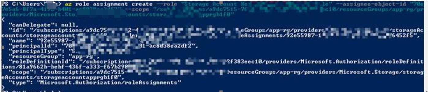 az role assignment create --role "Storage Account Key Operator Service Role" --assignee-object-id "xxxxxxxx-xxxx-xxxx-xxxx-efe0ge7cxxxx" --scope "/subscriptions/xxxxxxxx-xxxx-xxxx-xxxx-xxxxxxxxxxxx/resourceGroups/testrg/providers/Microsoft.Storage/storageAccounts/testsa01"