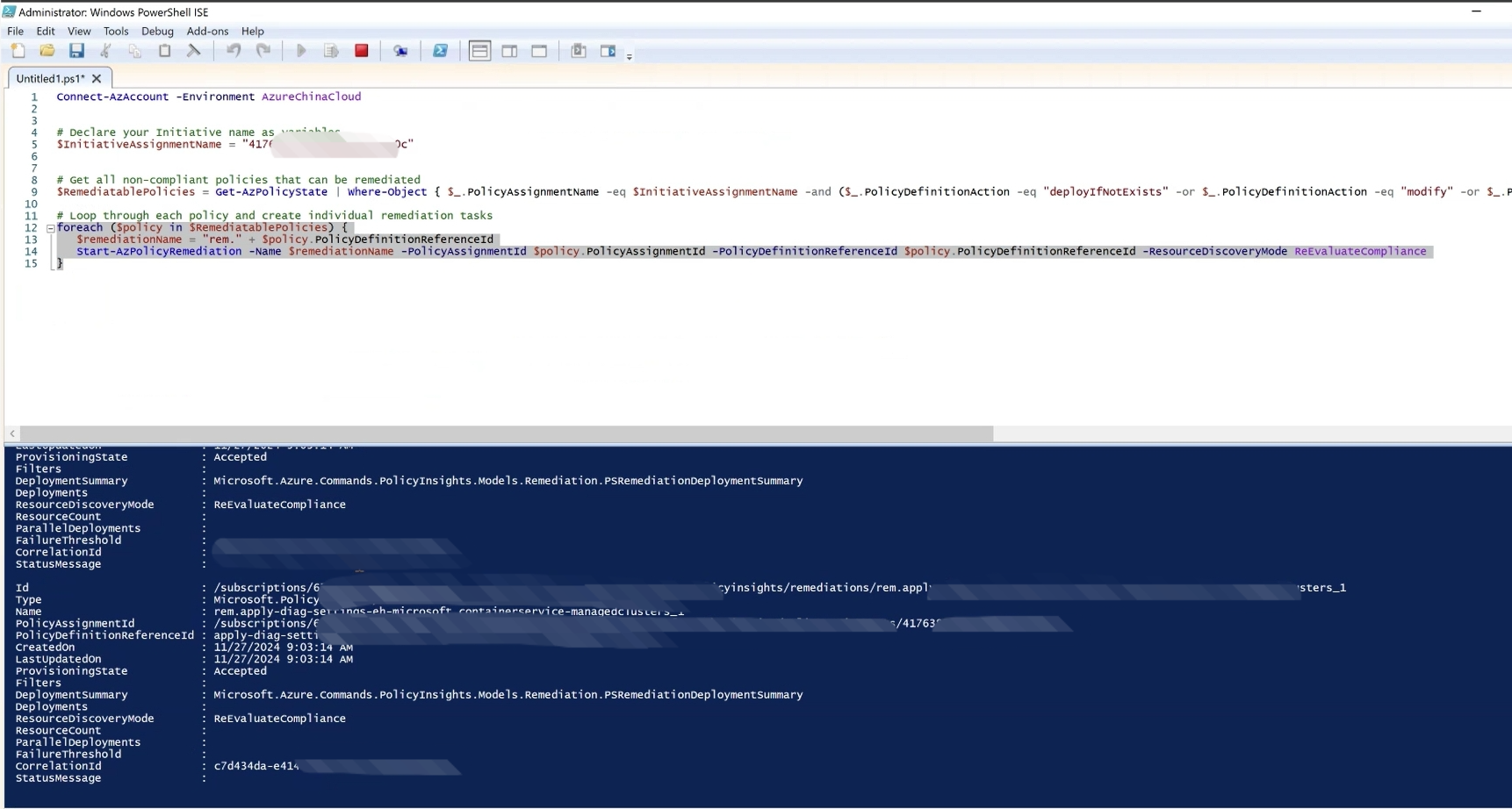 Automating Azure Remediation for Policy Initiatives with Azure PowerShell : https://techcommunity.microsoft.com/blog/azurepaasblog/automating-azure-remediation-for-policy-initiatives-with-azure-powershell/4113485
