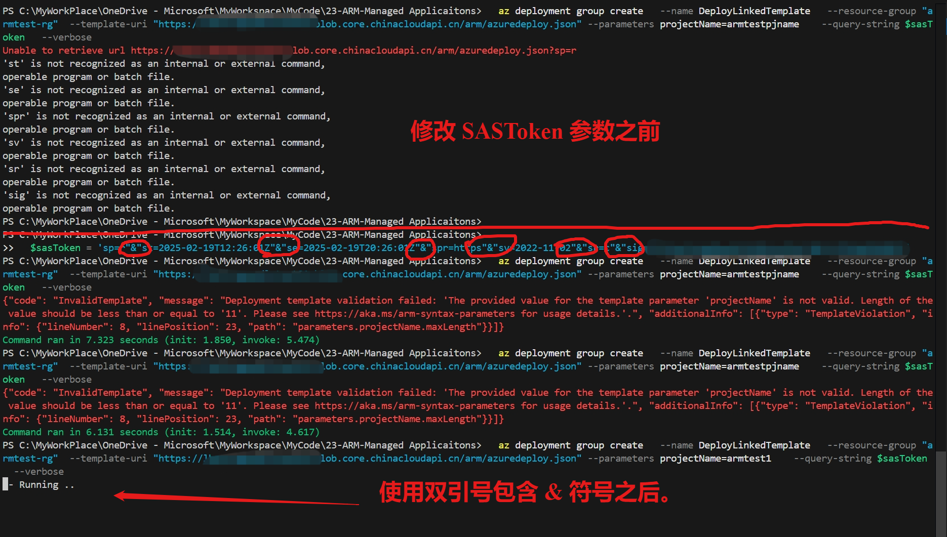 $sasToken = ' <SAS Token> ‘ az deployment group create --name DeployLinkedTemplate --resource-group "armtest-rg" --template-uri "https://<stroage account name>.blob.core.chinacloudapi.cn/arm/azuredeploy.json" --parameters projectName=armtestpjname --query-string $sasToken --verbose