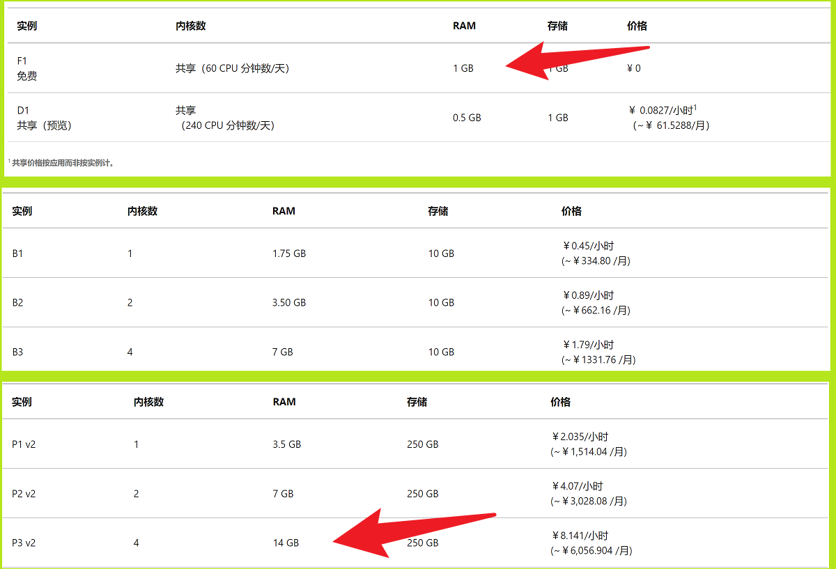 面对部署后刚开始启动就出现OOM的错误情况,表示当前定价层的Memroy不足以满足应用的运行。但是App Service不同定价层的内存不同,最低的免费层的RAM为1G,最高可达到14G。