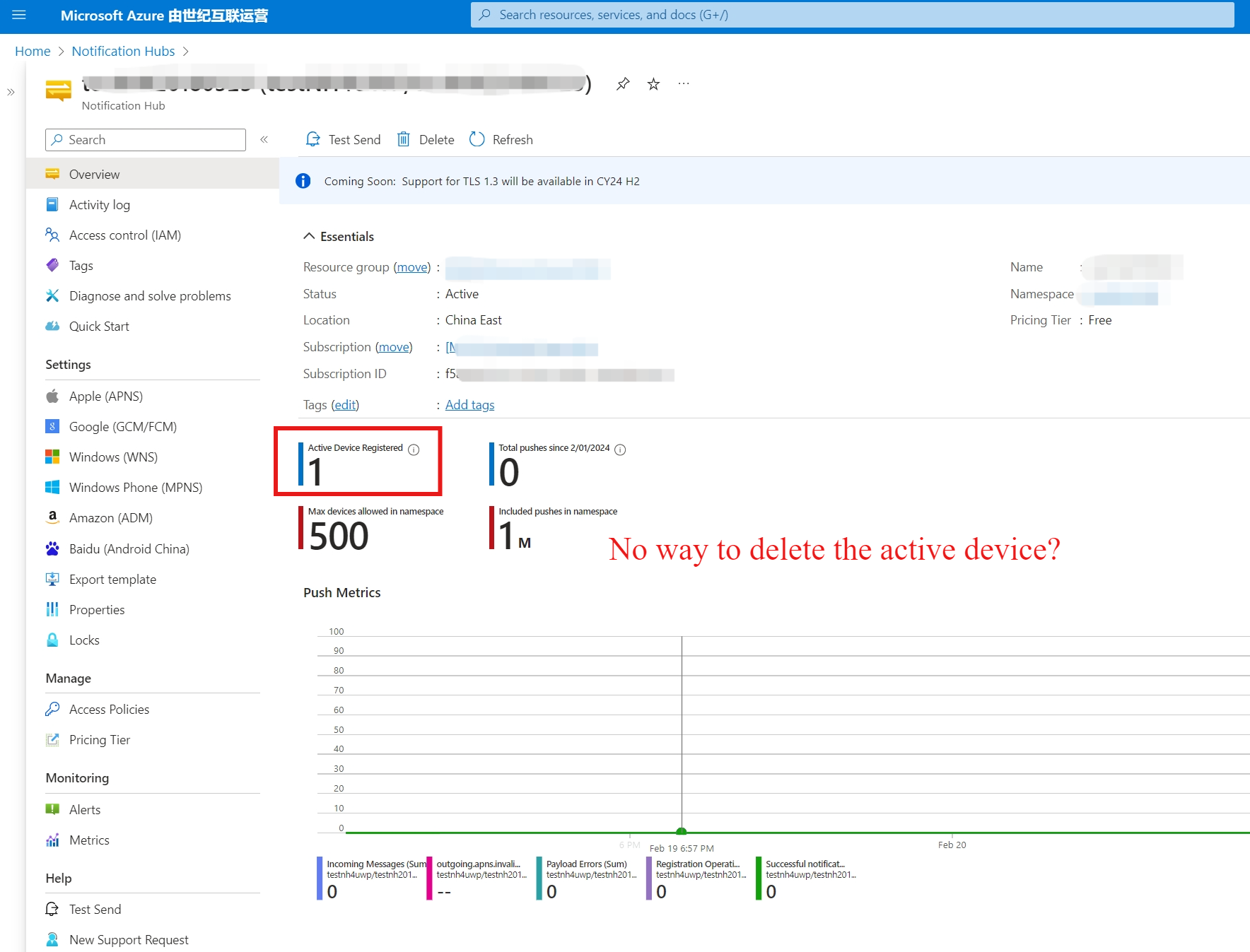 在Notification Hub中注册了设备后,从Azure门户上没有找到相应的入口来删除已注册设备 (Active Devices)