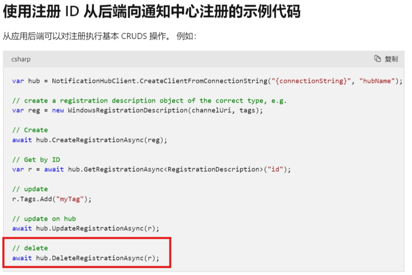 注册管理 (DeleteRegistrationAsync) : https://docs.azure.cn/zh-cn/notification-hubs/notification-hubs-push-notification-registration-management#example-code-to-register-with-a-notification-hub-from-a-backend-using-a-registration-id